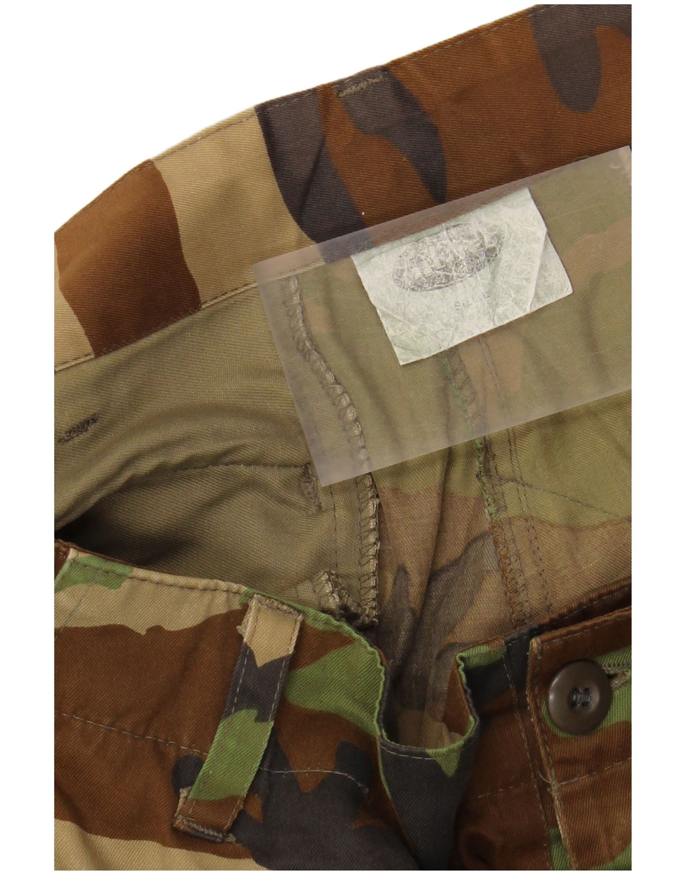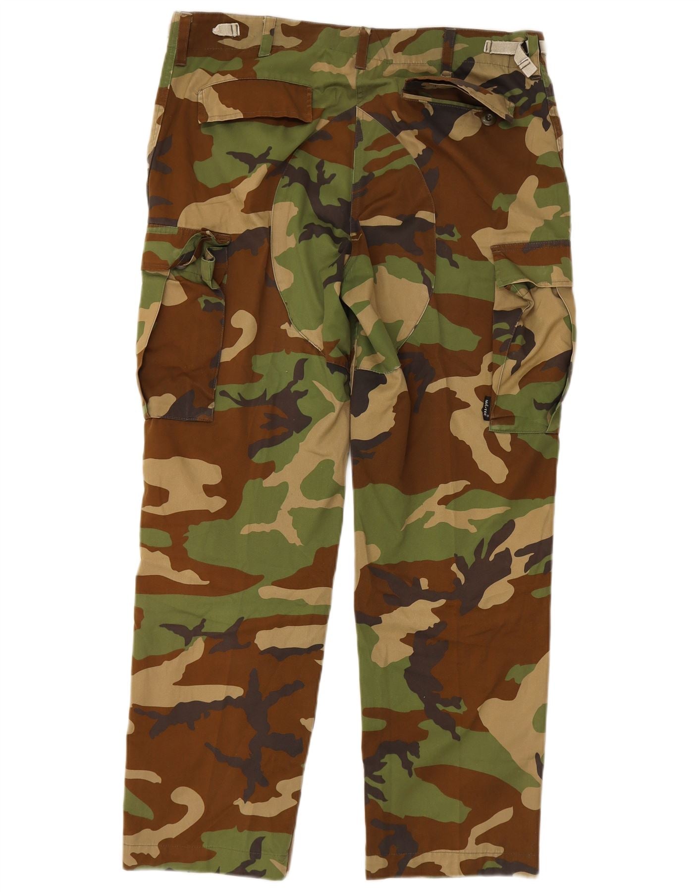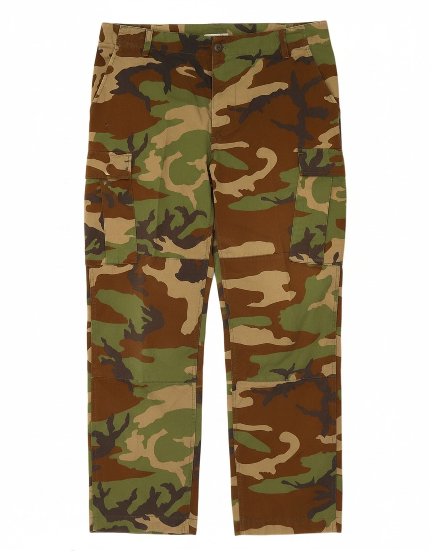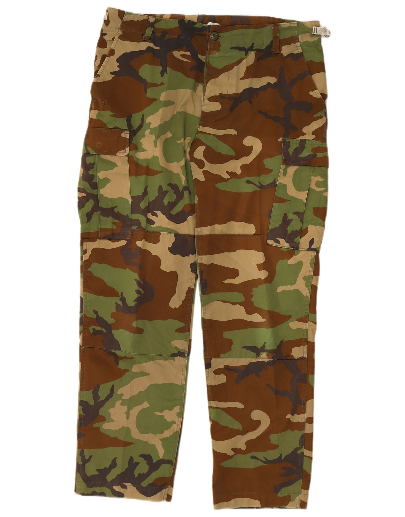 - AI Description: These Vintage mens cargo trousers are crafted from durable woven fabric. They feature a distinctive multicoloured camouflage pattern, blending green, brown, and khaki tones. The regular fit ensures comfortable wear. A button closure secures the waist. Practical pockets offer ample storage. An adjustable waist provides a customisable fit. This army style offers both rugged utility and a classic aesthetic.