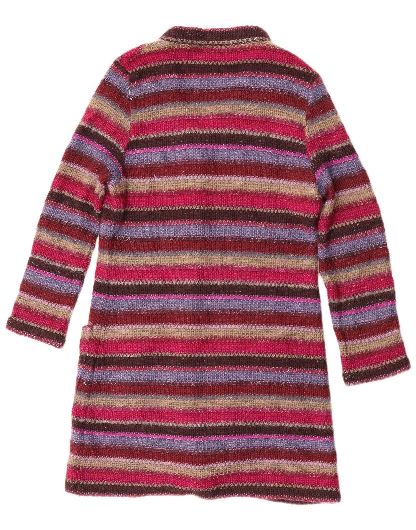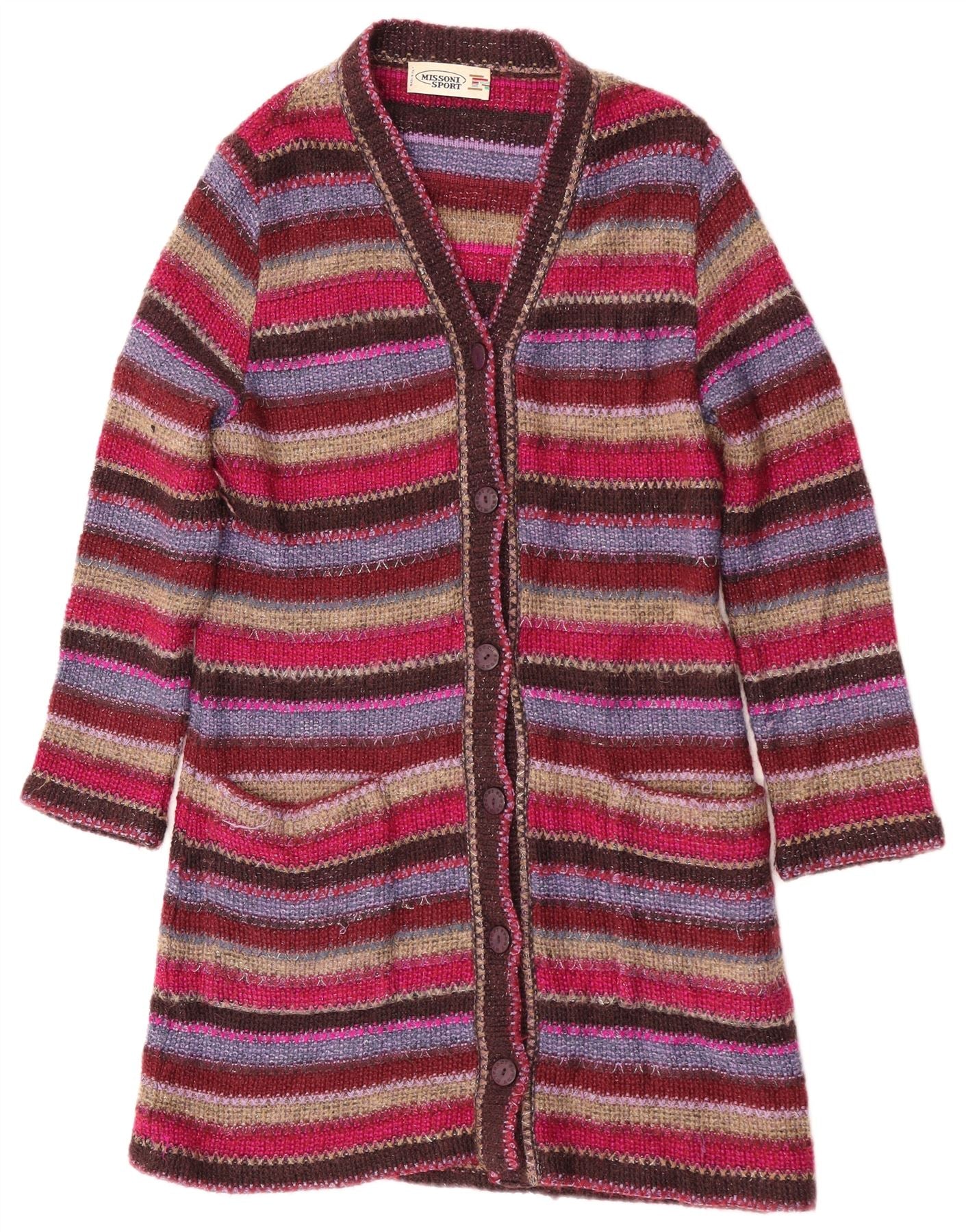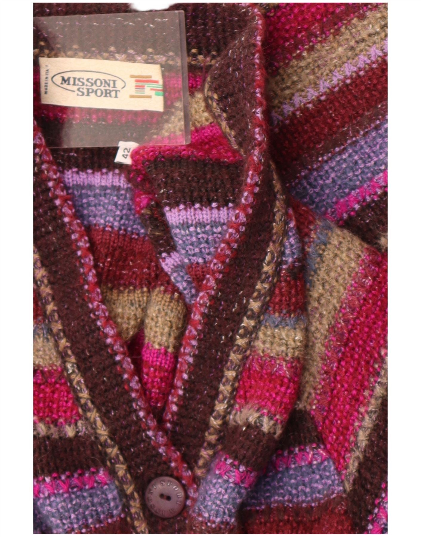 - Описание ИИ: Женский кардиган Missoni Sport выполнен из разноцветного трикотажа, создающего богатую текстуру. Он имеет яркий полосатый узор в оттенках красного, фиолетового и коричневого. V-образный вырез и застежка на пуговицы спереди создают классический силуэт. Имеет рукава длиной 3/4 и стандартный удлиненный крой. Два передних кармана добавляют практичности. Эта вещь сочетает в себе комфорт и неповторимый стиль.