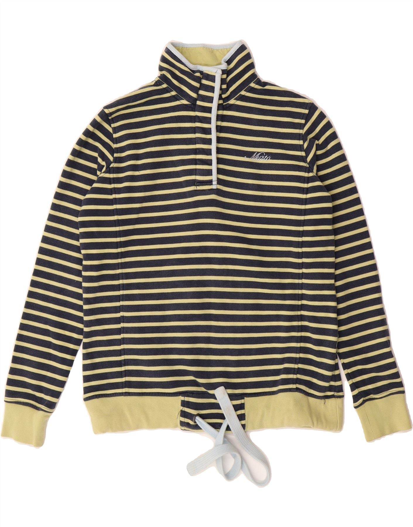 - AI Description: This Musto women's sweatshirt jumper offers nautical style with a striped pattern and graphic feature. Crafted from 100% cotton knit fabric, it boasts a comfortable regular fit and long sleeves, perfect for casual wear. The blue collared neckline and 1/4 zip add a touch of detail. Pre-owned in excellent condition, with minor loose stitching at the bottom hem. Label size 8. Machine washable at 30°.