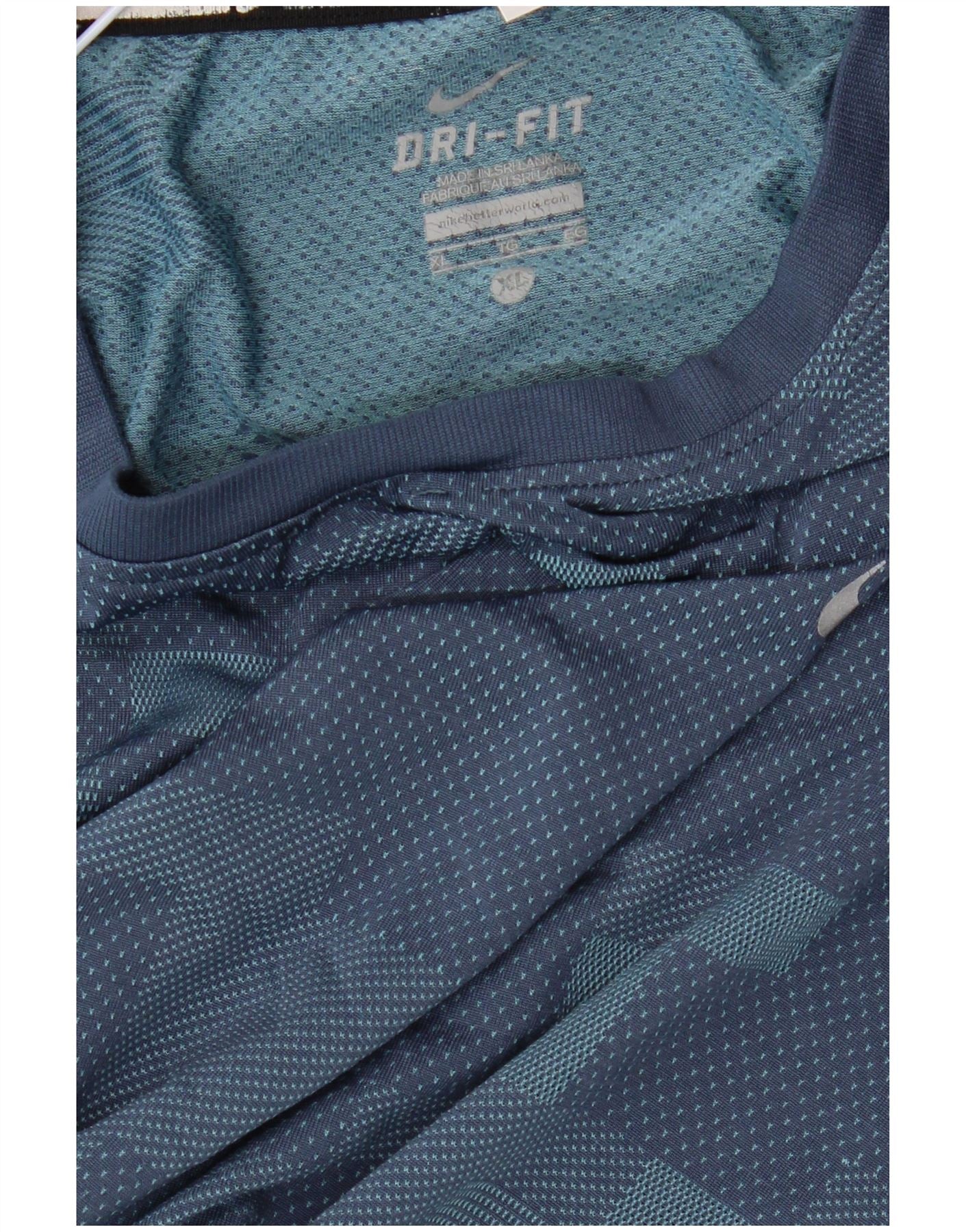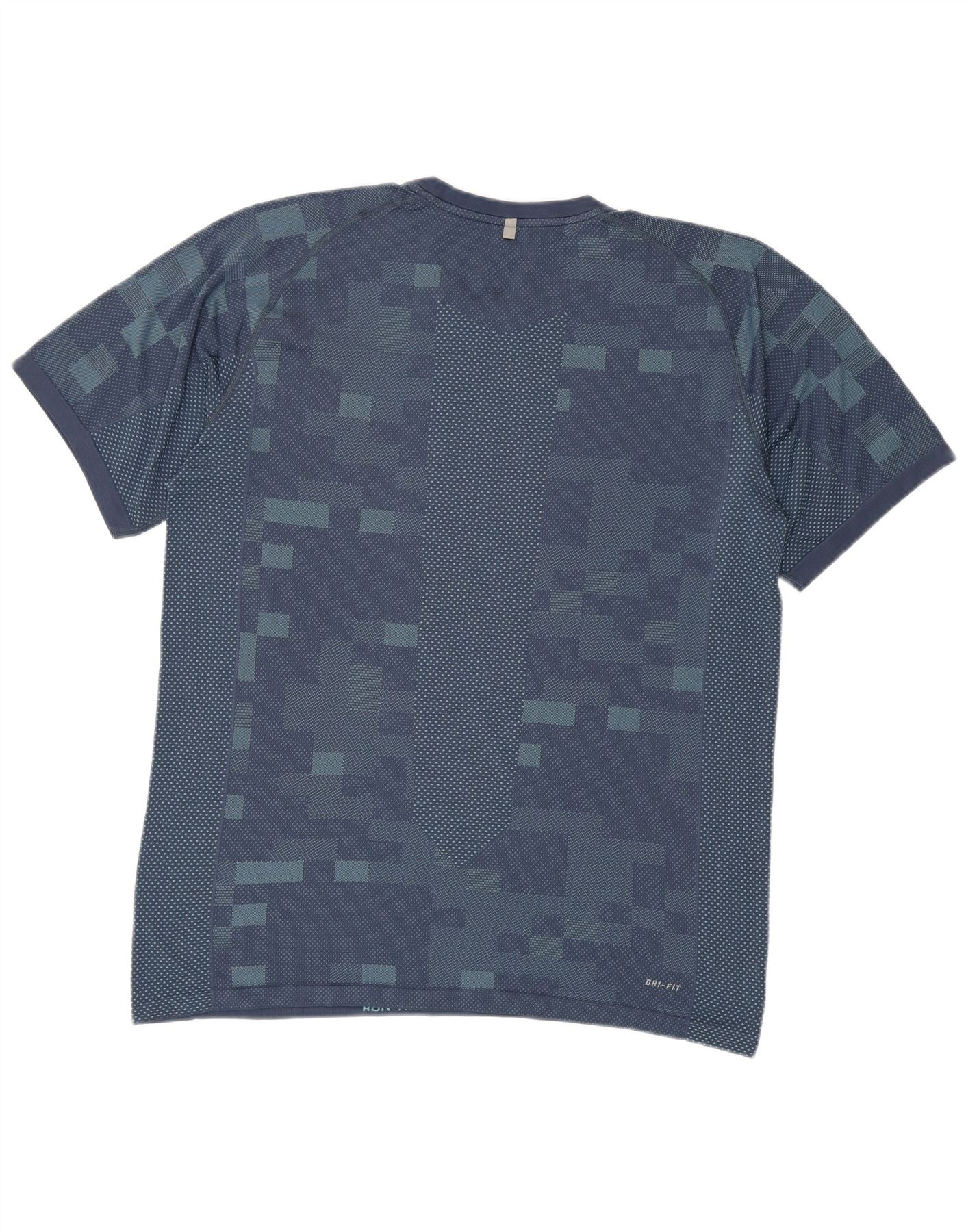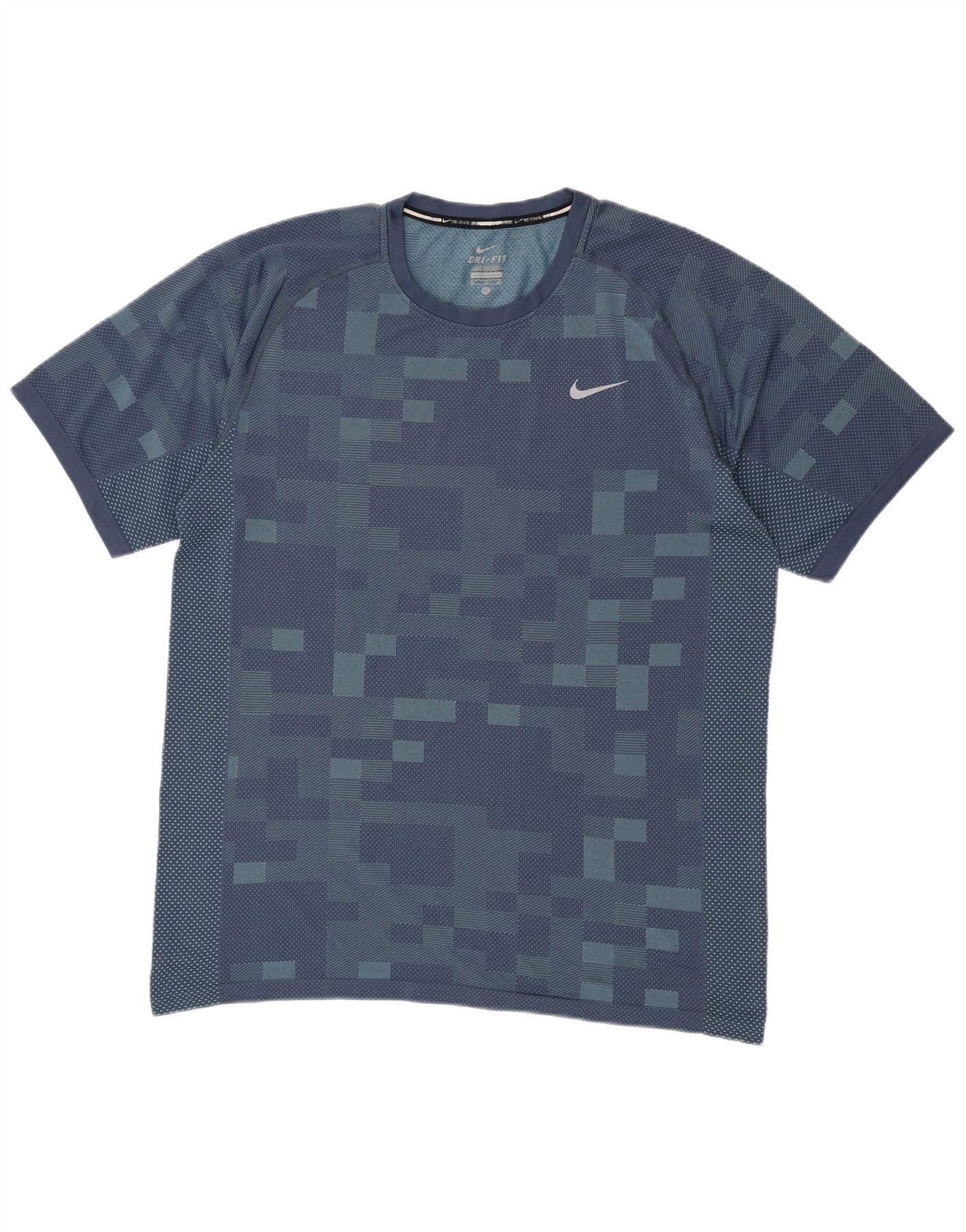 - AI Description: This Nike mens Graphic T-Shirt Top is crafted from a blue performance knit, featuring Nike Dri-Fit technology for breathability and lightweight comfort. It has a classic round neck and short sleeves, offering a regular fit for ease of movement. The geometric pattern adds a modern, athletic aesthetic. An accent logo provides subtle branding. This top is ideal for running and other sports activities, combining style with high performance.