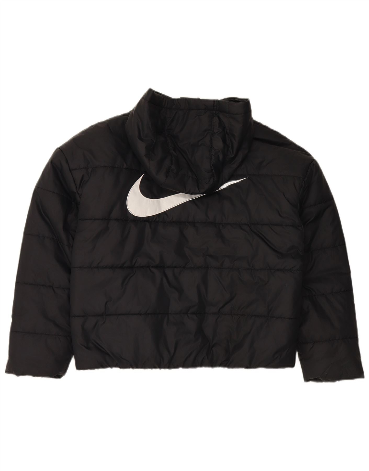 - AI Description: This Nike womens padded jacket is crafted from a durable woven fabric, offering a sleek black finish. Its padded construction provides excellent thermal warmth. It features a high neck and a practical hood for added protection. Long sleeves and a regular fit ensure comfortable wear. A full zip closure secures the front, complemented by convenient pockets. The design is finished with a subtle brand logo accent.