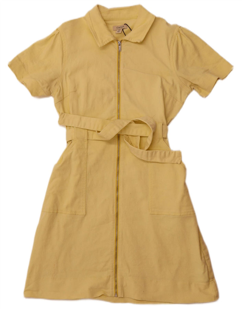 - AI Description: This Oasis womens shirt dress comes in a vibrant yellow woven fabric. It features a smart collared neckline and short sleeves. The regular fit is enhanced by a flattering belted waist. A zip closure ensures a smooth front. Practical pockets add functionality. Modern cut out details and strap accents complete the contemporary design.