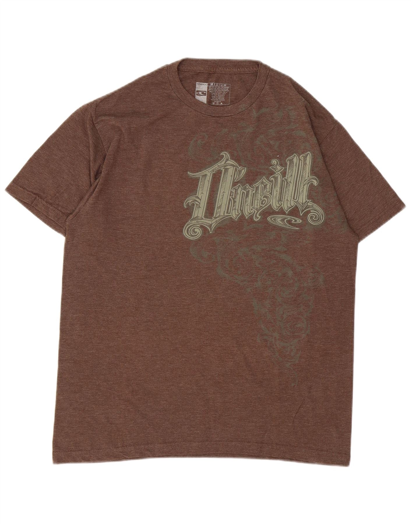 - AI Description: This O'Neill mens Graphic T-Shirt Top is crafted from a soft brown cotton polyester blend jersey fabric. It features a classic round neck and short sleeves. The pullover design offers a comfortable regular fit. A distinctive logo accent adds a retro touch to the front. This top combines comfort with a timeless style, perfect for everyday wear.