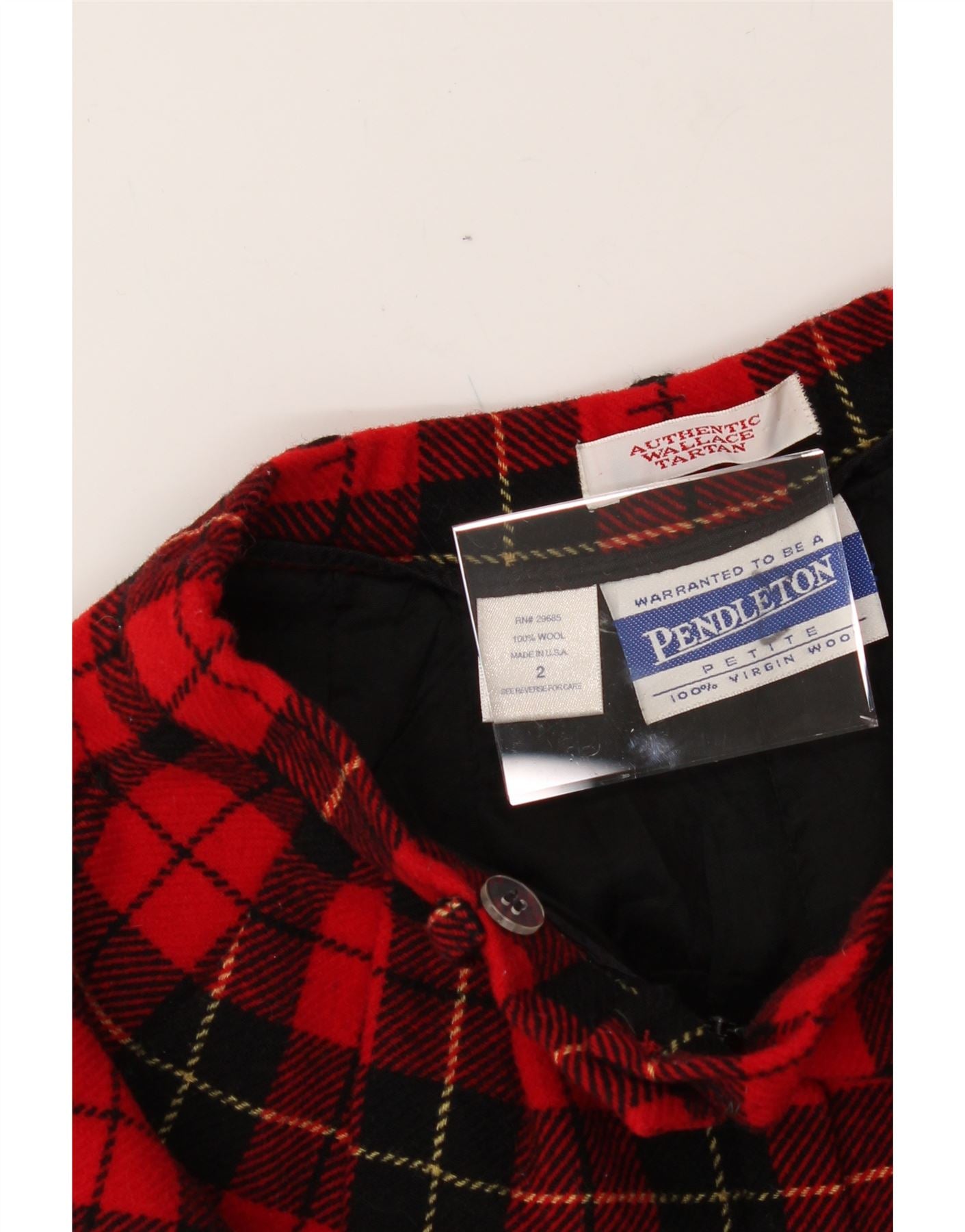 - AI Description: Pendleton women's shorts crafted from 100% virgin wool flannel in a red plaid pattern. These pre-owned, classic-style shorts feature a regular fit, pull-on closure, elastic waist, and pockets. Size 2, made in the USA. Minor hole or tear defect located on the front. Accented with a button. Recommended retail price £20.00.