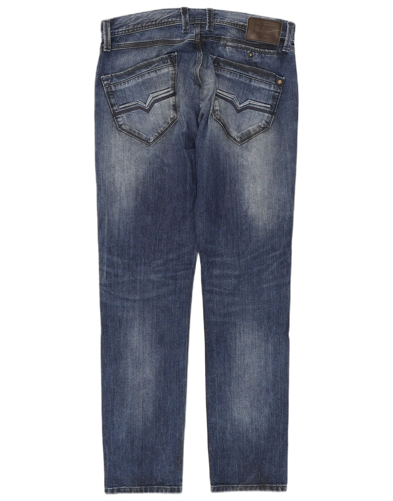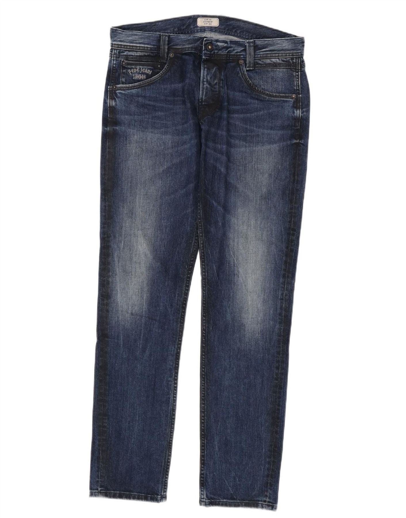 - AI Description: These PEPE Jeans mens Straight Jeans are crafted from classic blue denim. They feature a low waist and a button closure. The straight leg cut offers a regular fit. Practical pockets are included, along with a subtle logo accent. This classic style ensures timeless appeal and comfort for everyday wear.