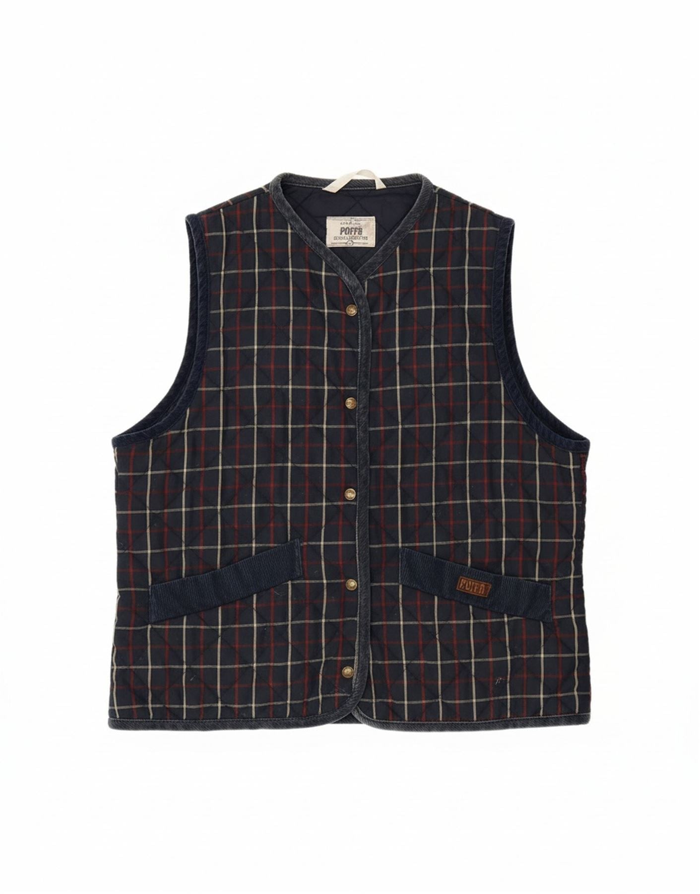 - AI Description: This Puffa womens waistcoat is presented in a deep navy blue blended fabric, featuring a distinguished plaid pattern. Its classic collared, sleeveless design offers a traditional silhouette. A five button front closure secures the regular fit, ensuring comfort. The waistcoat boasts a full lining and includes practical pockets for convenience. An adjustable waist allows for a tailored shape, completing this versatile and timeless piece. A subtle brand logo adds a refined touch.
