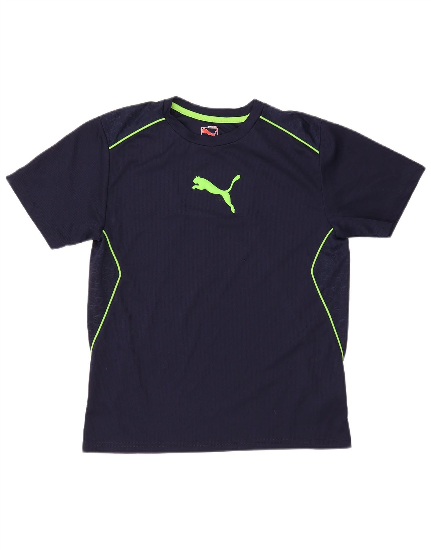 - Описание ИИ: Мужская футболка с рисунком Puma изготовлена из 100-процентного полиэстера, обеспечивающего легкий вес и воздухопроницаемость. Классический круглый вырез и короткие рукава обеспечивают комфорт. Темно-синяя ткань подчеркнута яркой неоново-зеленой окантовкой вдоль плеч и по бокам. На груди — заметный неоново-зеленый логотип Puma. На плечевых панелях видны изящные геометрические узоры. Этот топ стандартного кроя идеально подходит для занятий спортом и активного отдыха.