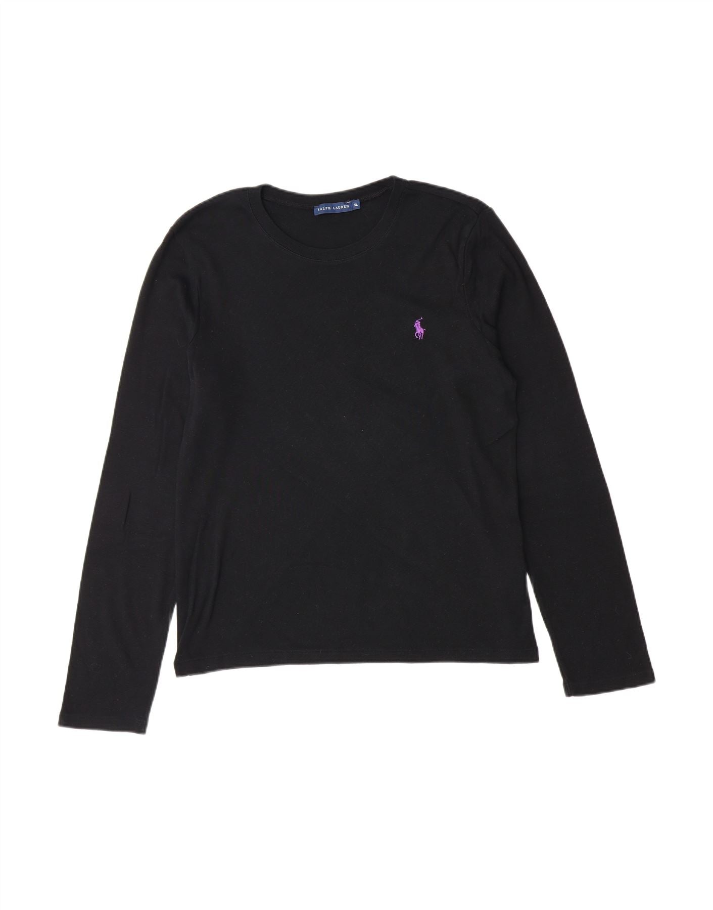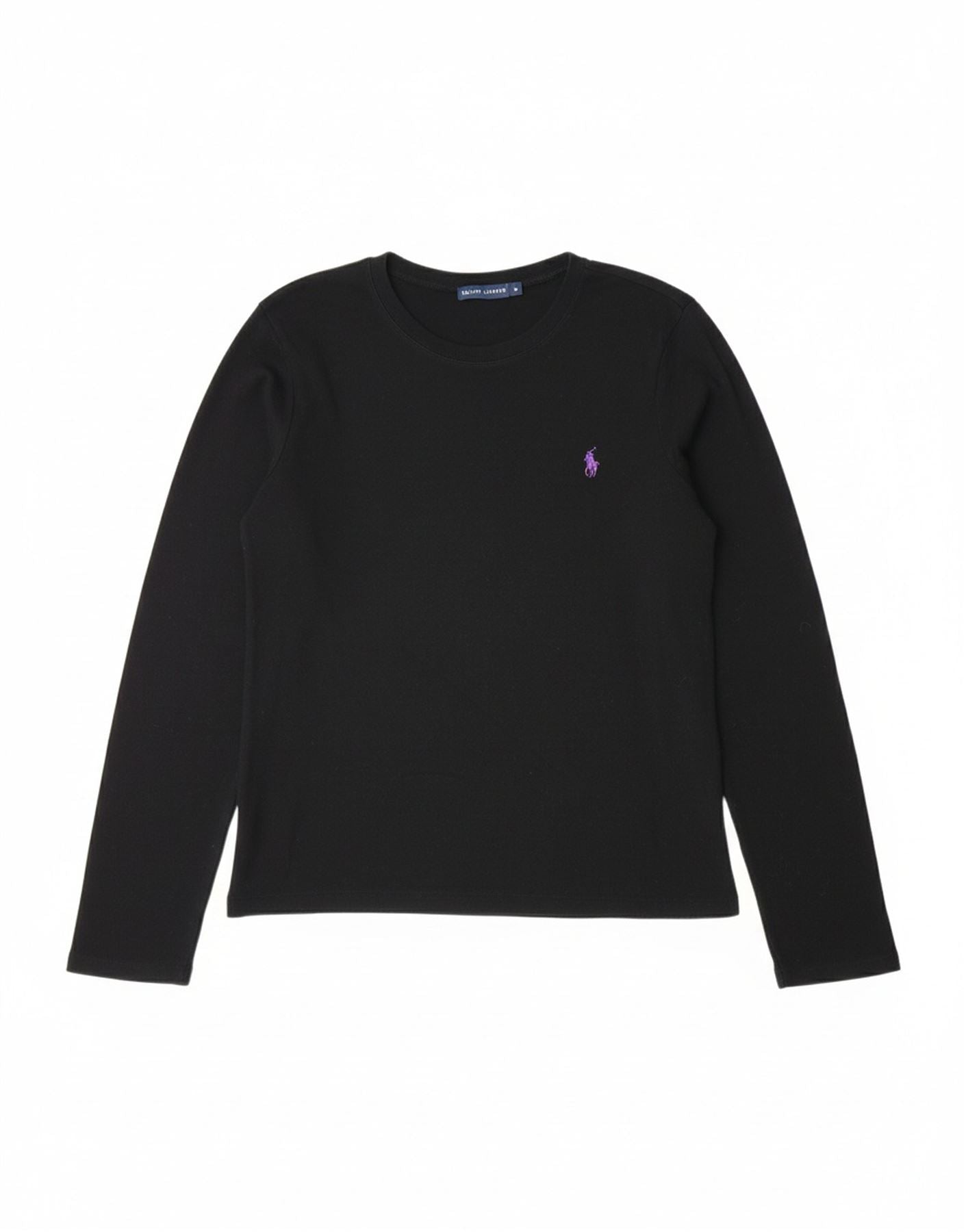 - AI Description: This Ralph Lauren womens graphic T-shirt is crafted from soft black cotton jersey. The round neckline and long sleeves offer a classic, comfortable look. It features a regular fit for effortless wear. A distinctive logo accent completes the design, adding a signature touch. This versatile top combines comfort with iconic style.