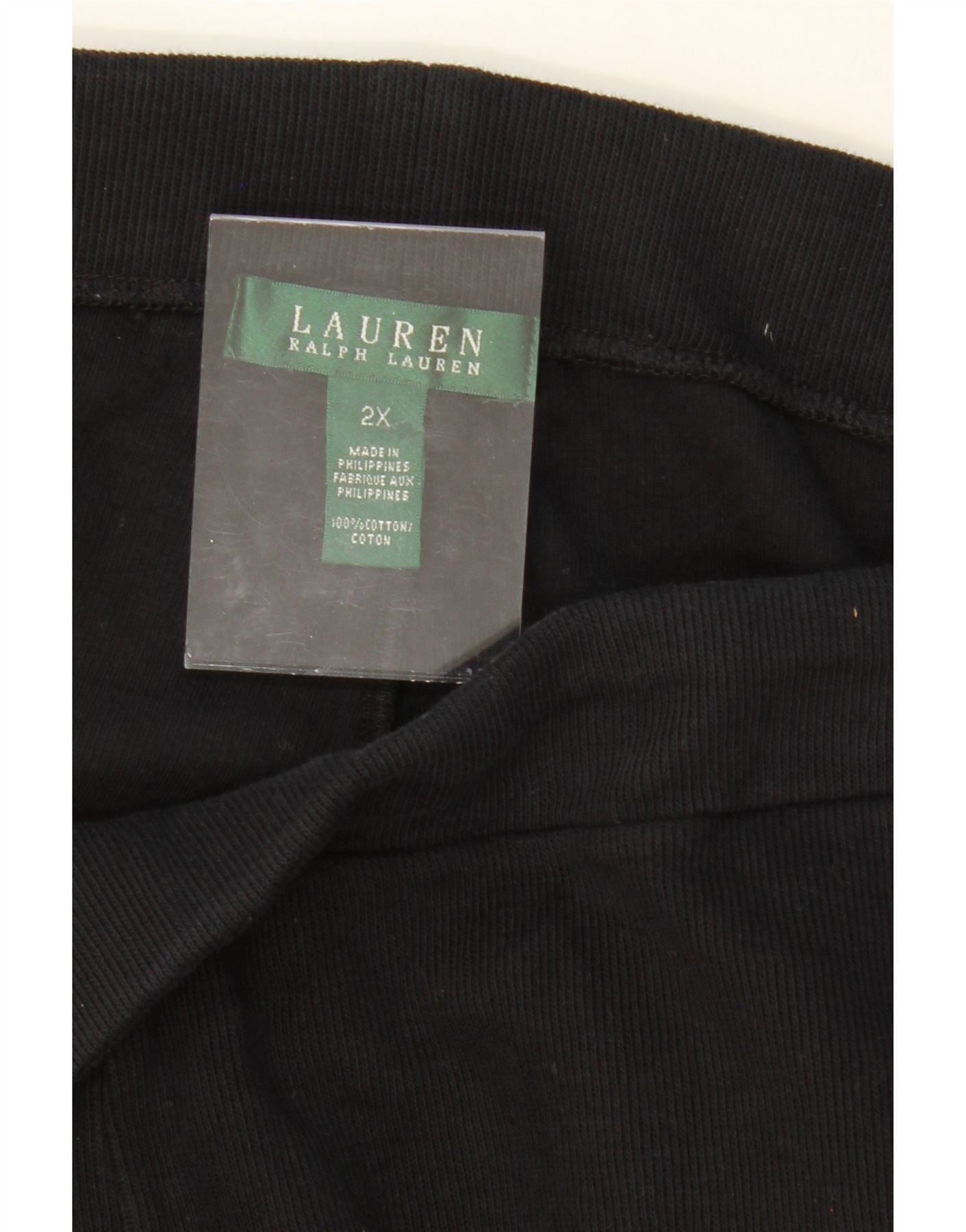 - AI Description: These pre-owned Ralph Lauren cropped trousers offer classic style and comfort. Crafted from 100% cotton knit, these wide-leg trousers feature an elastic waist, handy pockets, and a pull-on closure for ease of wear. The regular fit ensures a comfortable silhouette. Black in colour, these trousers also feature a button accent. Size 2X.