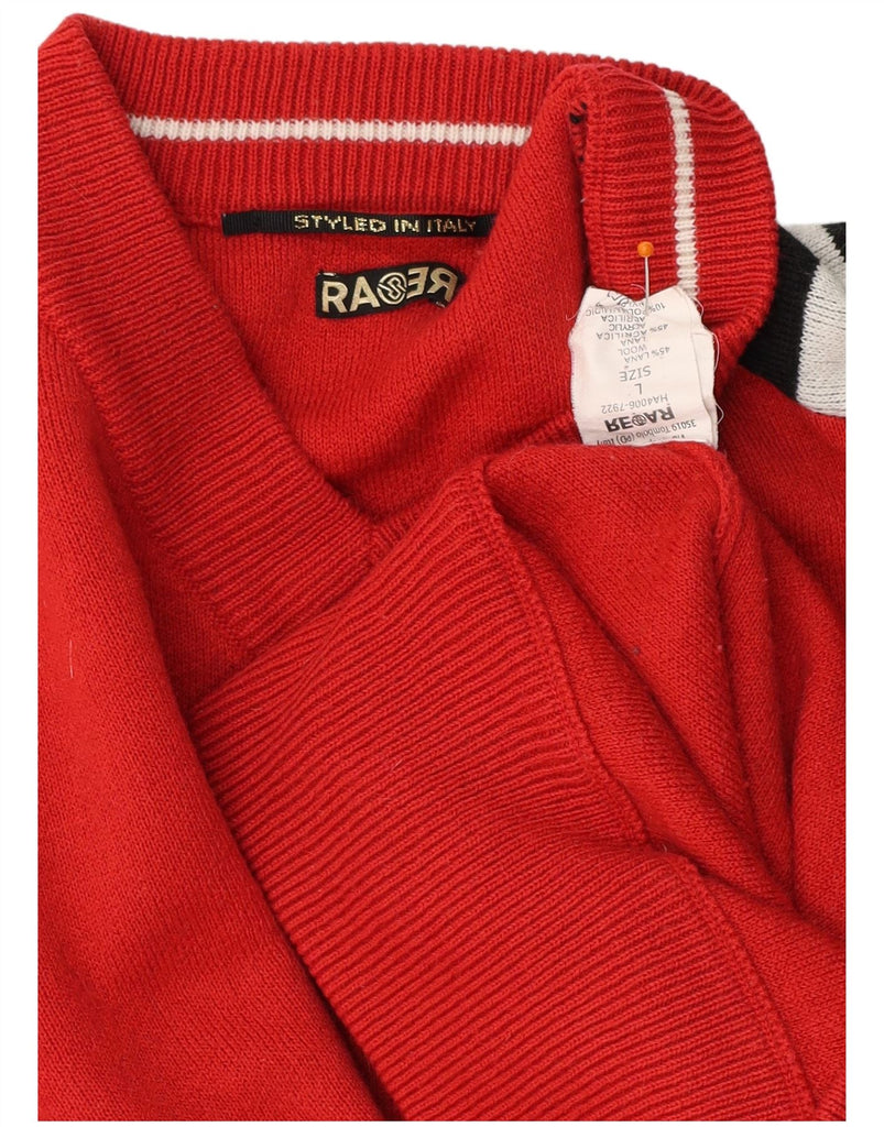 RARE Mens Graphic V-Neck Jumper Sweater Large Red Colourblock Wool