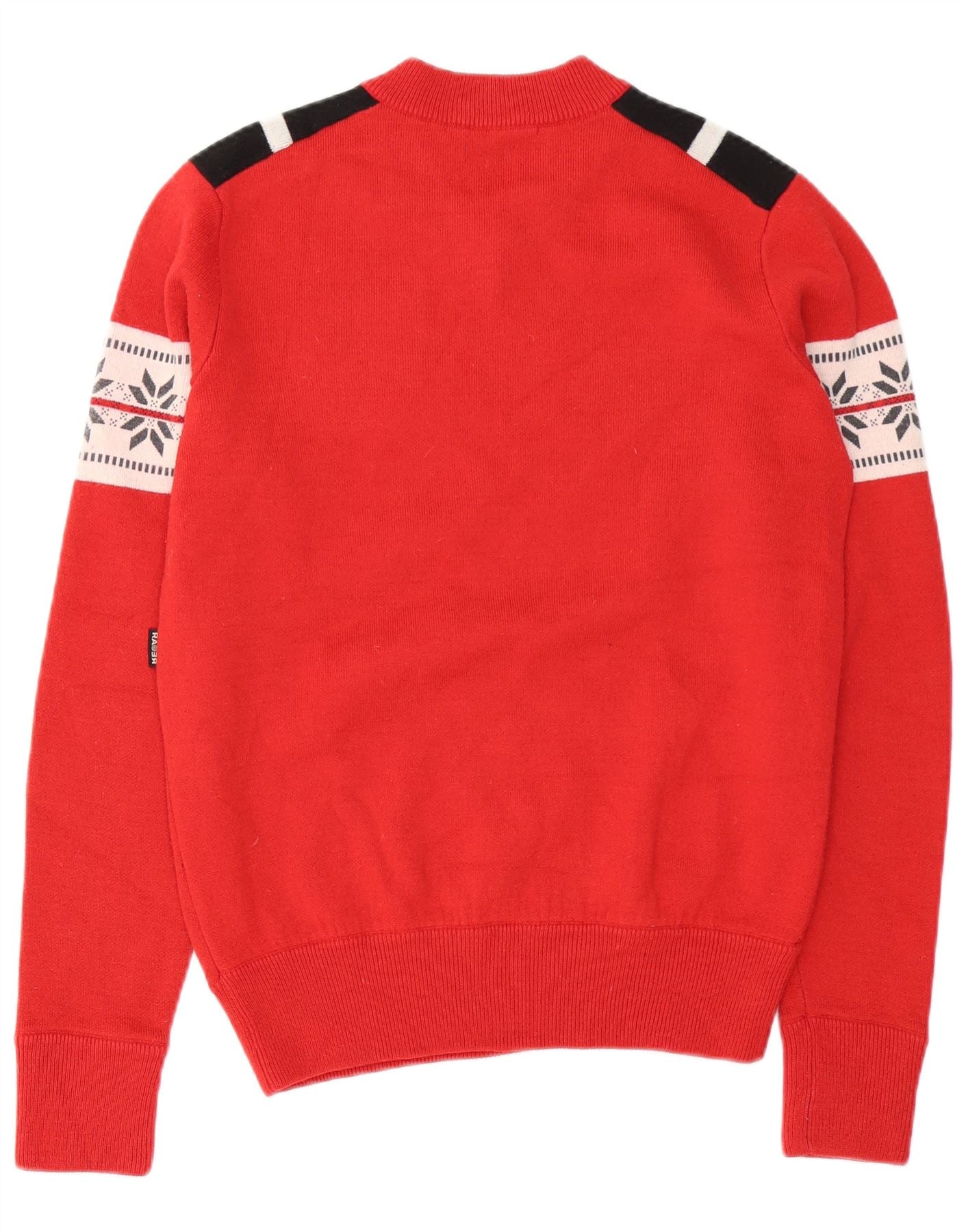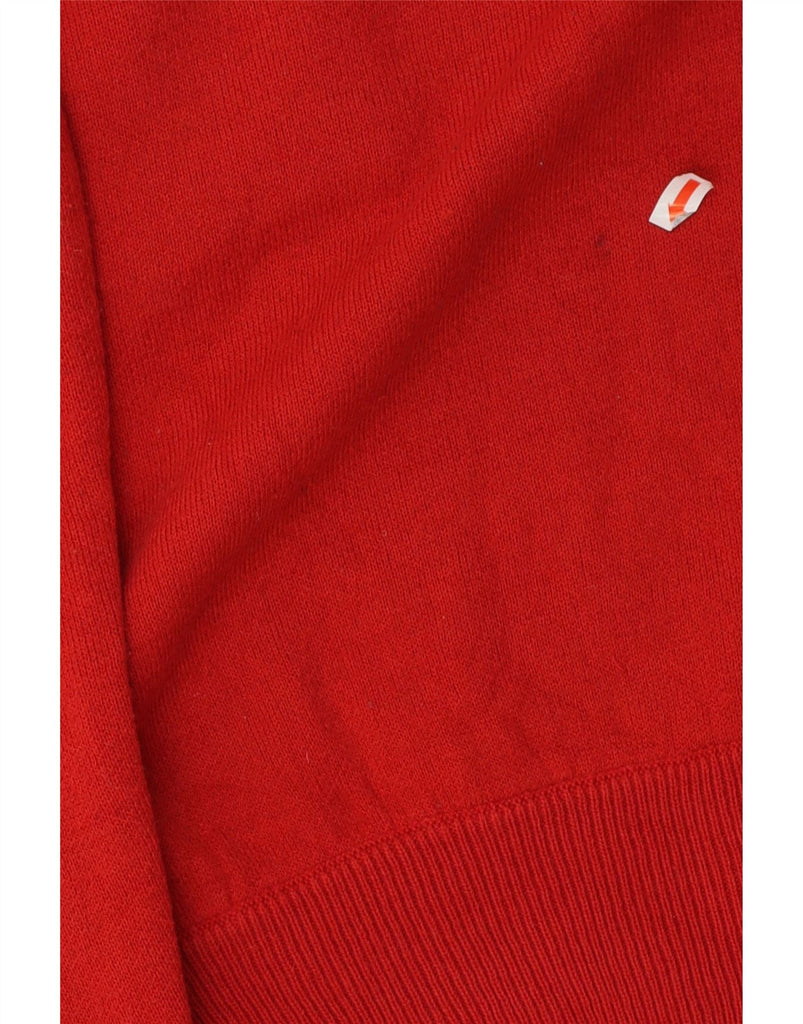 - AI Description: This RA39 mens V-neck jumper is crafted from a comfortable acrylic and wool blend knit. Its rich red hue offers a bold look. The V-neckline and long sleeves provide a classic silhouette. A regular fit ensures ease of movement and comfort. This pullover features a distinctive graphic and logo, celebrating the Italia Team for skiing. It combines warmth with a sporty, refined style.