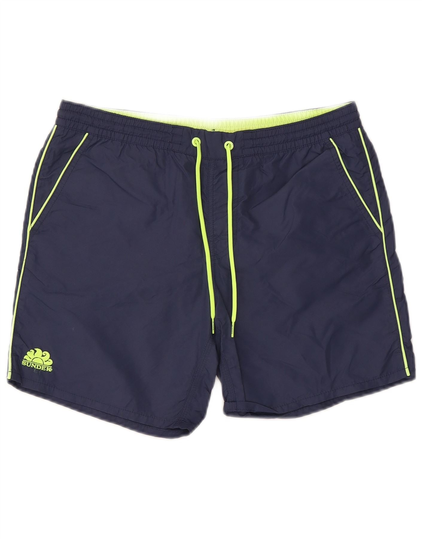 - Описание ИИ: Мужские шорты для плавания Sundek изготовлены из 100-процентной полиэфирной ткани темно-синего оттенка. Они имеют удобную эластичную талию с застежкой-кулиской для регулируемой посадки. Неоново-желтая окантовка и соответствующий логотип создают яркий контраст. Правильная посадка и внутренняя часть на подкладке обеспечивают комфорт и практичность при плавании. Боковые карманы обеспечивают удобное хранение.