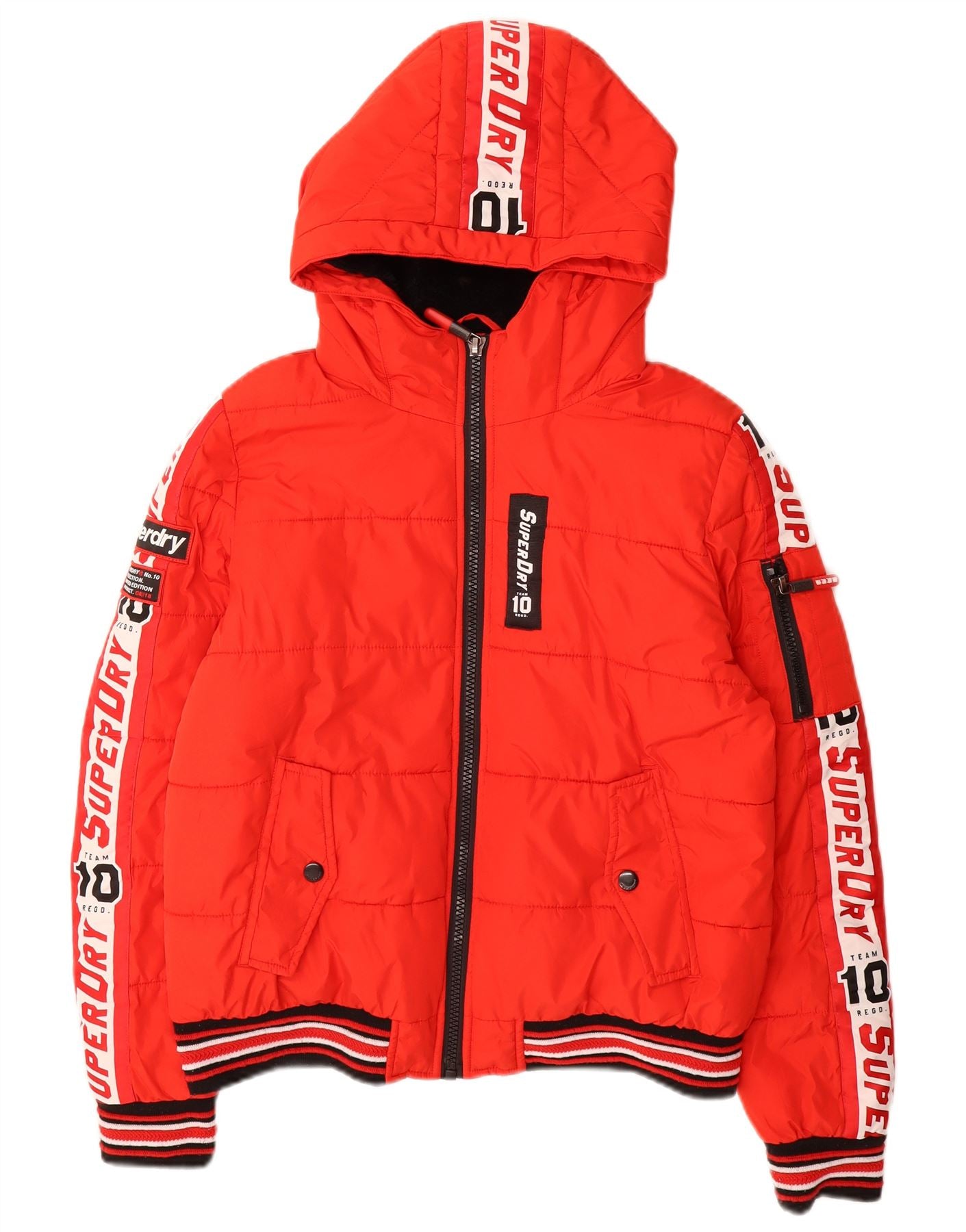 - AI Description: This Superdry womens padded jacket comes in a vibrant red woven fabric. It features a practical hooded design and a full zip closure. The padded construction offers warmth and comfort. Long sleeves and a regular fit ensure ease of wear. Functional pockets add utility. A distinctive logo accent completes the sporty aesthetic.