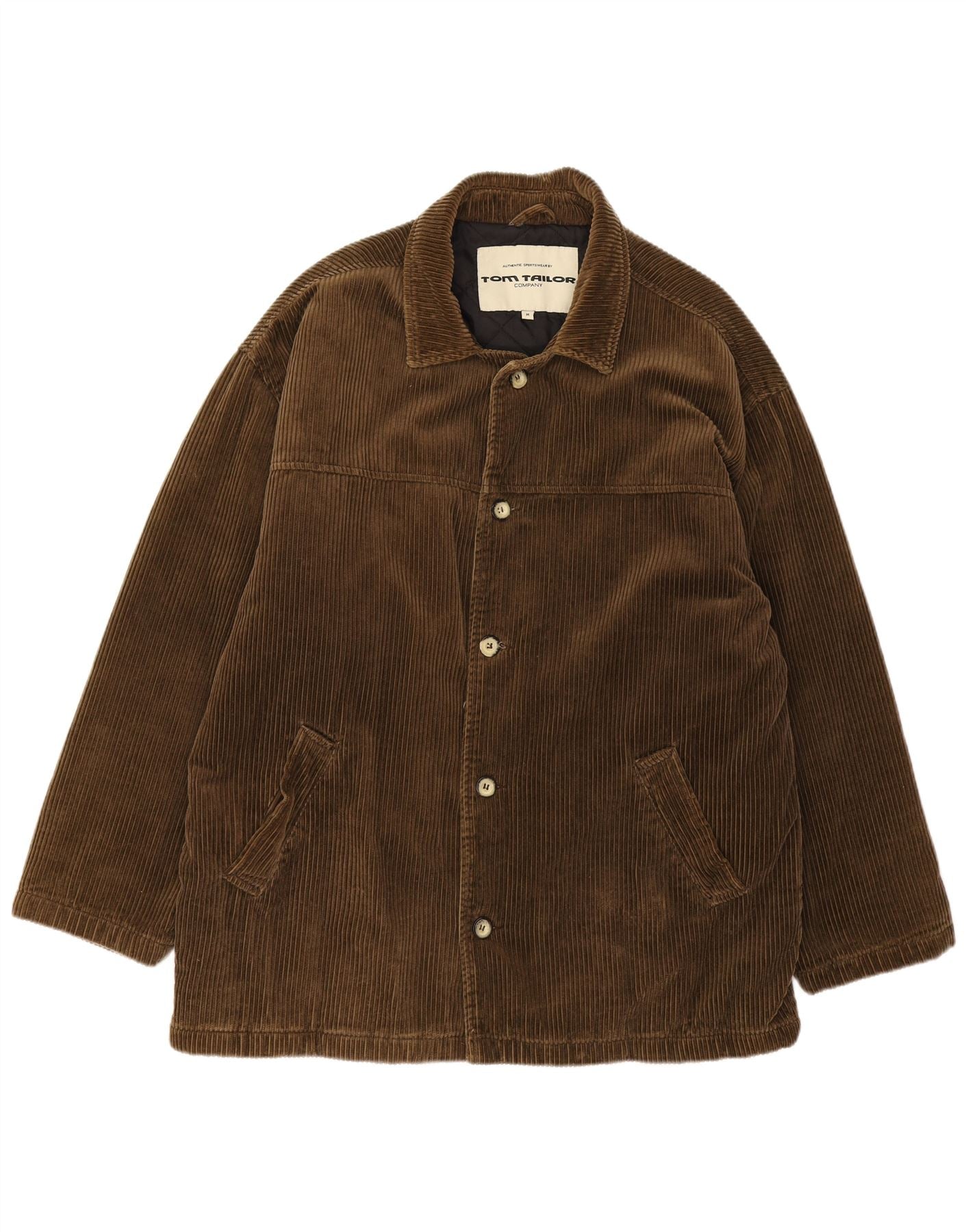 - AI Description: This Tom Tailor mens Corduroy Jacket is crafted from rich brown cotton corduroy, offering a distinctive textured finish. It features a classic collared neckline and a full button-up front for a timeless look. Long sleeves and a relaxed fit ensure comfortable wear. Practical pockets add functionality, while the fully lined interior provides extra warmth. This jacket combines classic style with everyday utility.