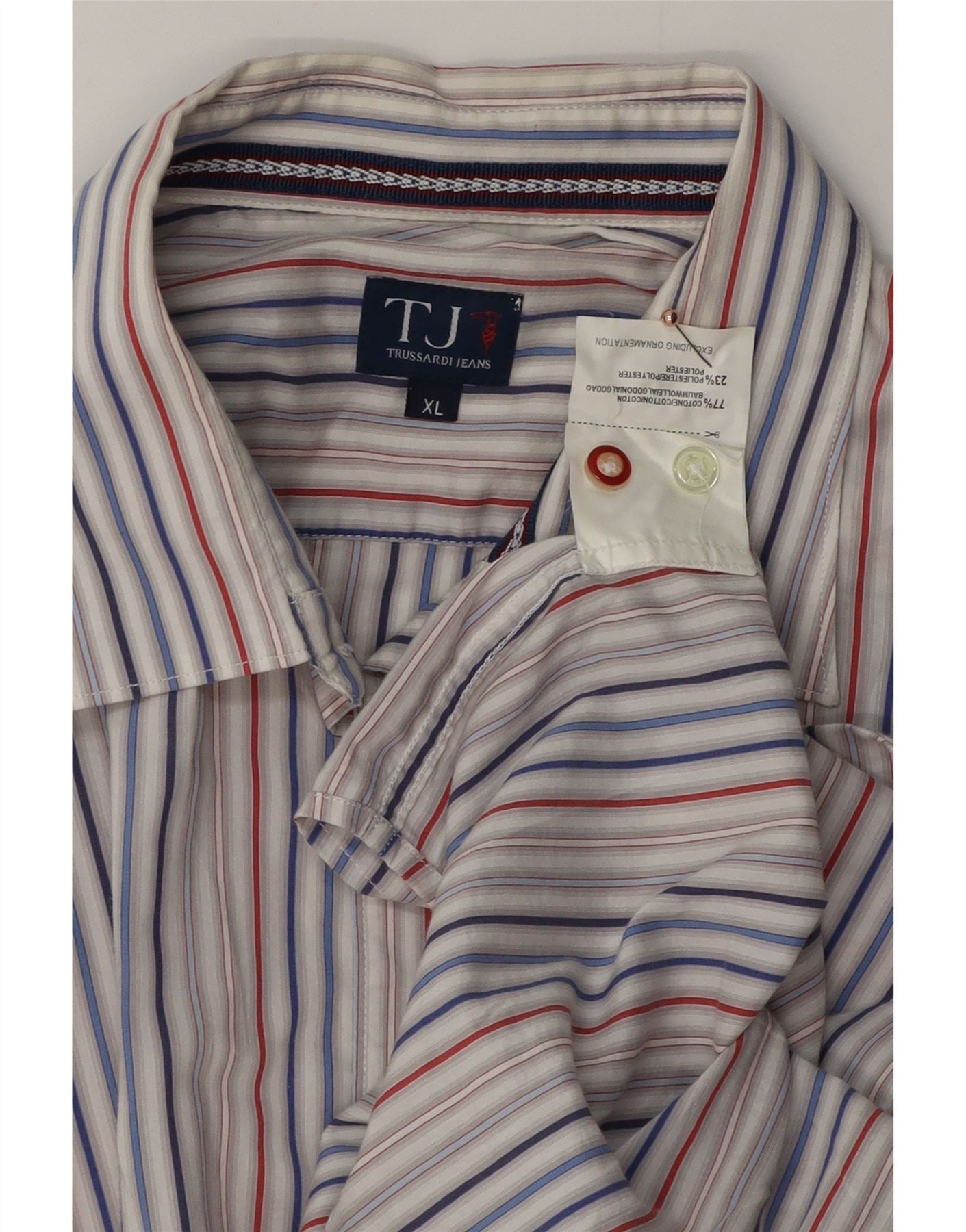 - Описание ИИ: Мужская рубашка Trussardi Jeans изготовлена из комфортной хлопчатобумажной ткани. Имеет классический вырез горловины и застежку на пуговицы спереди. Разноцветный полосатый узор красного, синего и серого цветов создает элегантную и повседневную эстетику. Длинные рукава с манжетами на пуговицах завершают дизайн. Регулярная посадка обеспечивает удобный и универсальный силуэт.