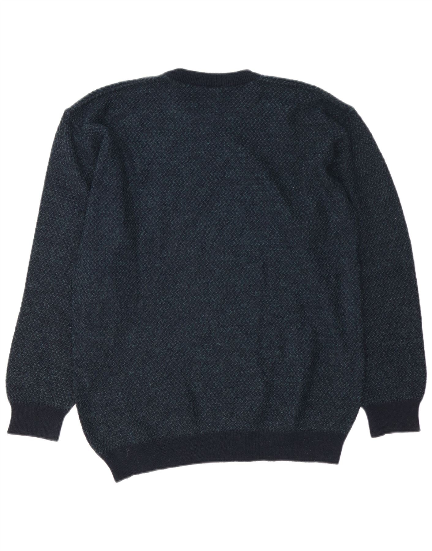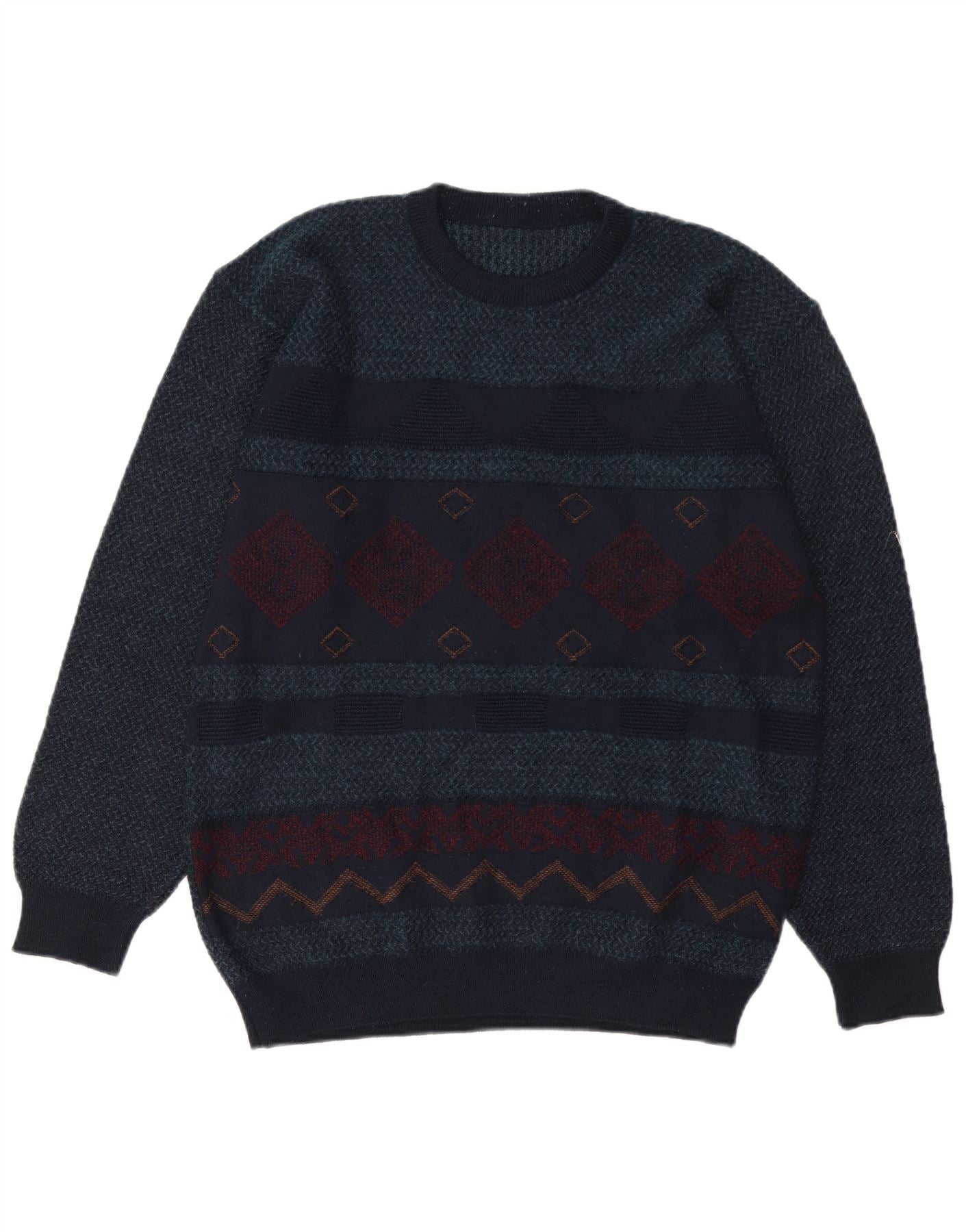 ВИНТАЖНЫЙ мужской джемпер с круглым вырезом, средний темно-синий с геометрическим узором