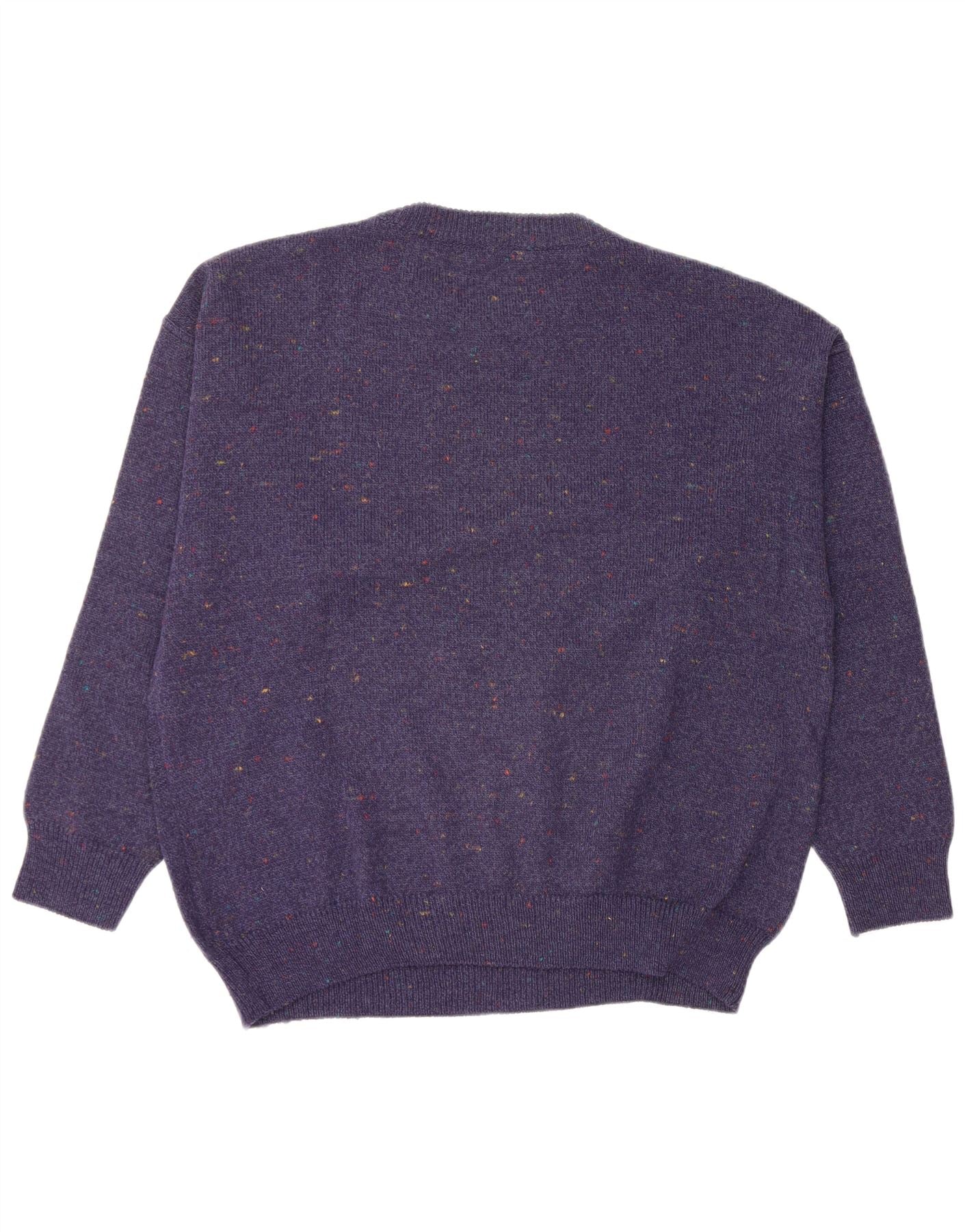 - Описание ИИ: Этот винтажный мужской джемпер с круглым вырезом выполнен из удобного трикотажа из смеси акрила, шерсти и нейлона. Он имеет мягкую текстуру с тонкими разноцветными крапинками по всей фиолетовой основе. Классический круглый вырез и длинные рукава создают неподвластный времени силуэт. Регулярная посадка обеспечивает комфортное ношение. Смелые геометрические узоры контрастных цветов украшают переднюю часть, создавая неповторимый стиль ретро. Ребристые манжеты и подол завершают дизайн.