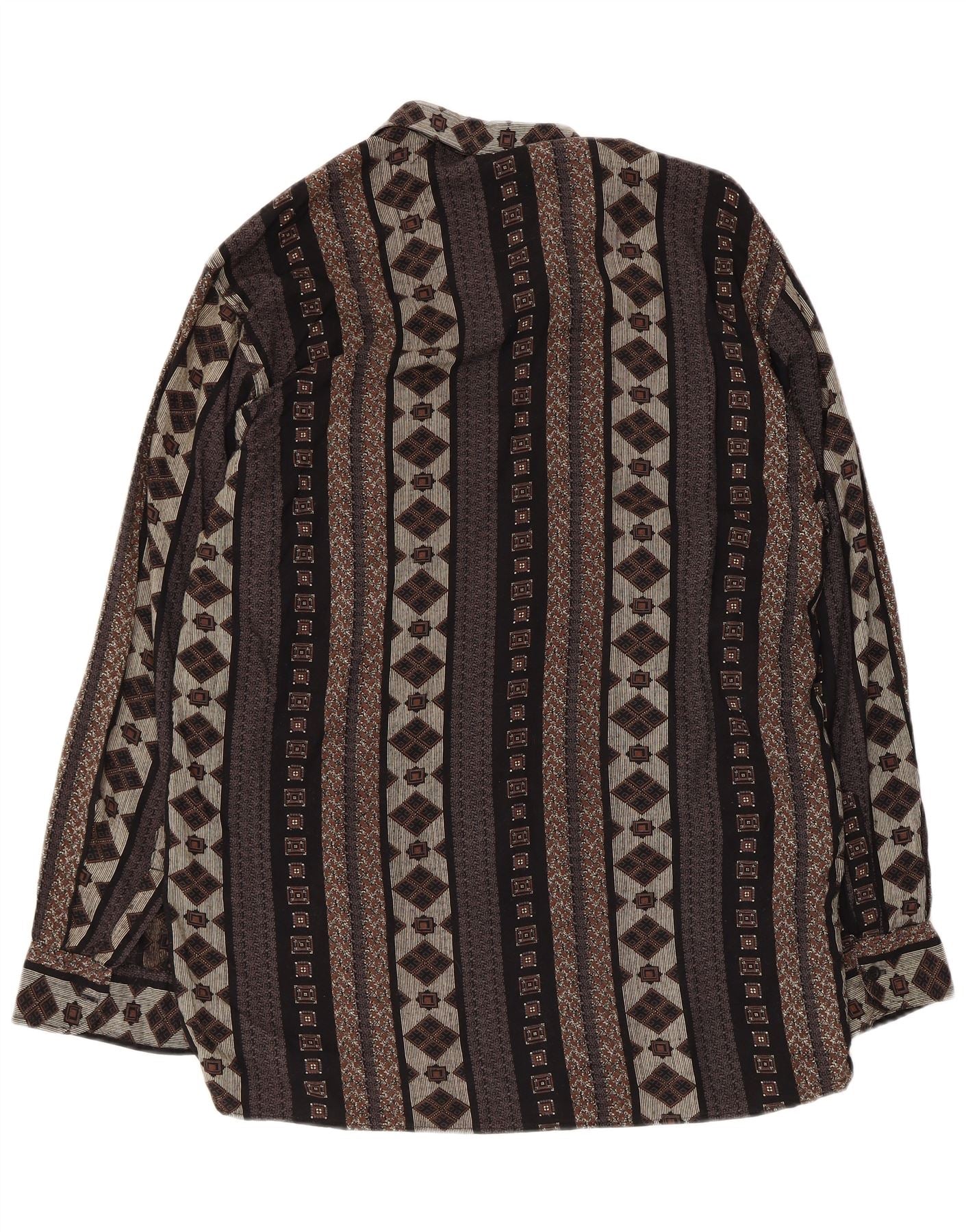 - Описание ИИ: Эта винтажная мужская рубашка изготовлена из тканого материала, обеспечивающего комфорт. Он имеет яркий геометрический абстрактный узор в черных, коричневых и серых тонах. Вырез с воротником и застежка на пуговицы спереди создают классическую структуру. Длинные рукава заканчиваются манжетами на пуговицах. Правильная посадка обеспечивает комфортное ношение. Тональные пуговицы и изящные карманы дополняют дизайн в стиле ретро.