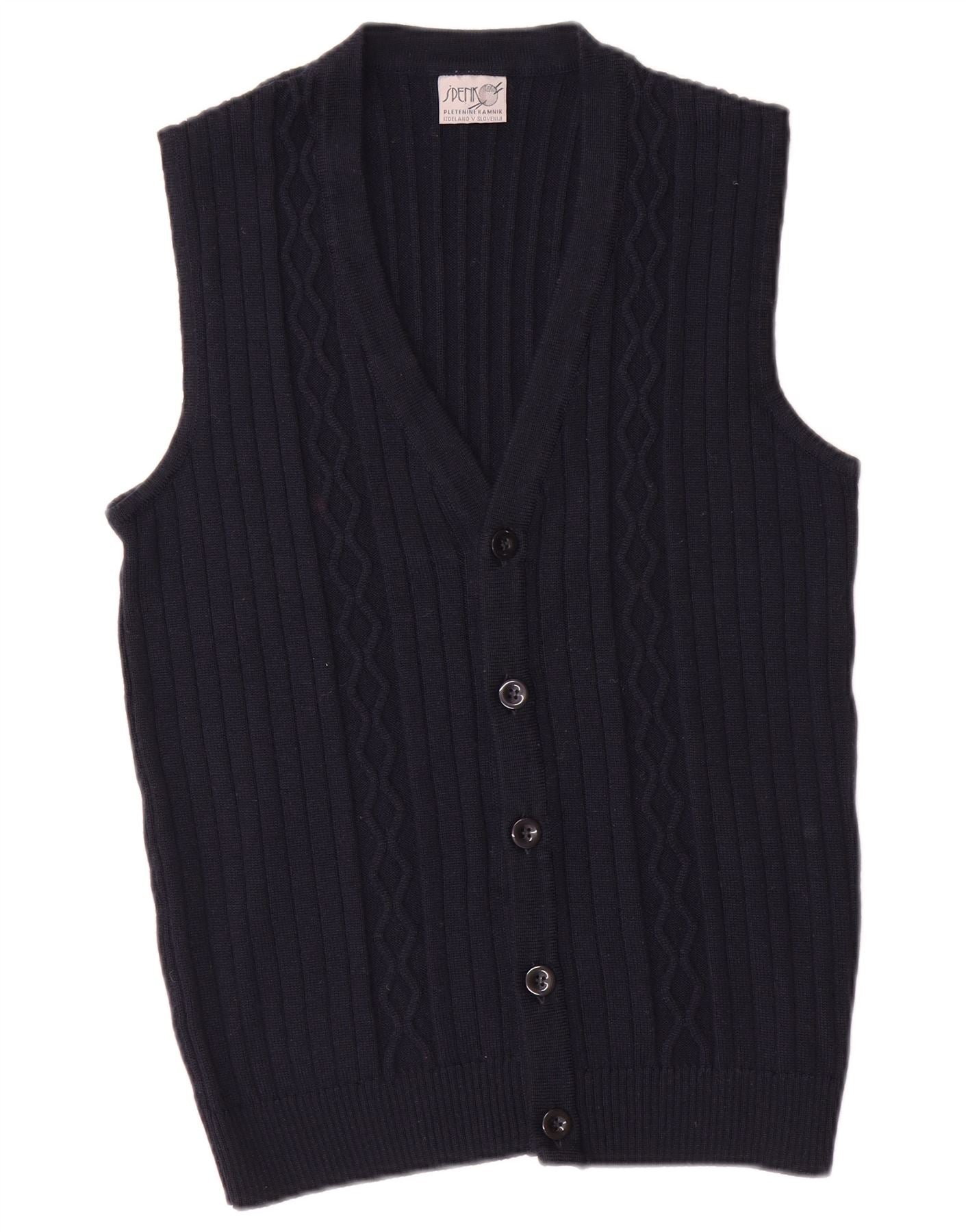 - Описание ИИ: Этот винтажный женский жилет выполнен из мягкого акрилового трикотажа темно-синего цвета с удобной ребристой текстурой и тонкими вертикальными деталями. Имеет классический V-образный вырез и модель без рукавов. Регулярная посадка обеспечивает удобство ношения. Застежка на пять пуговиц спереди с пуговицами в тон завершает традиционный образ. Эта вещь предлагает вневременной стиль и комфорт.