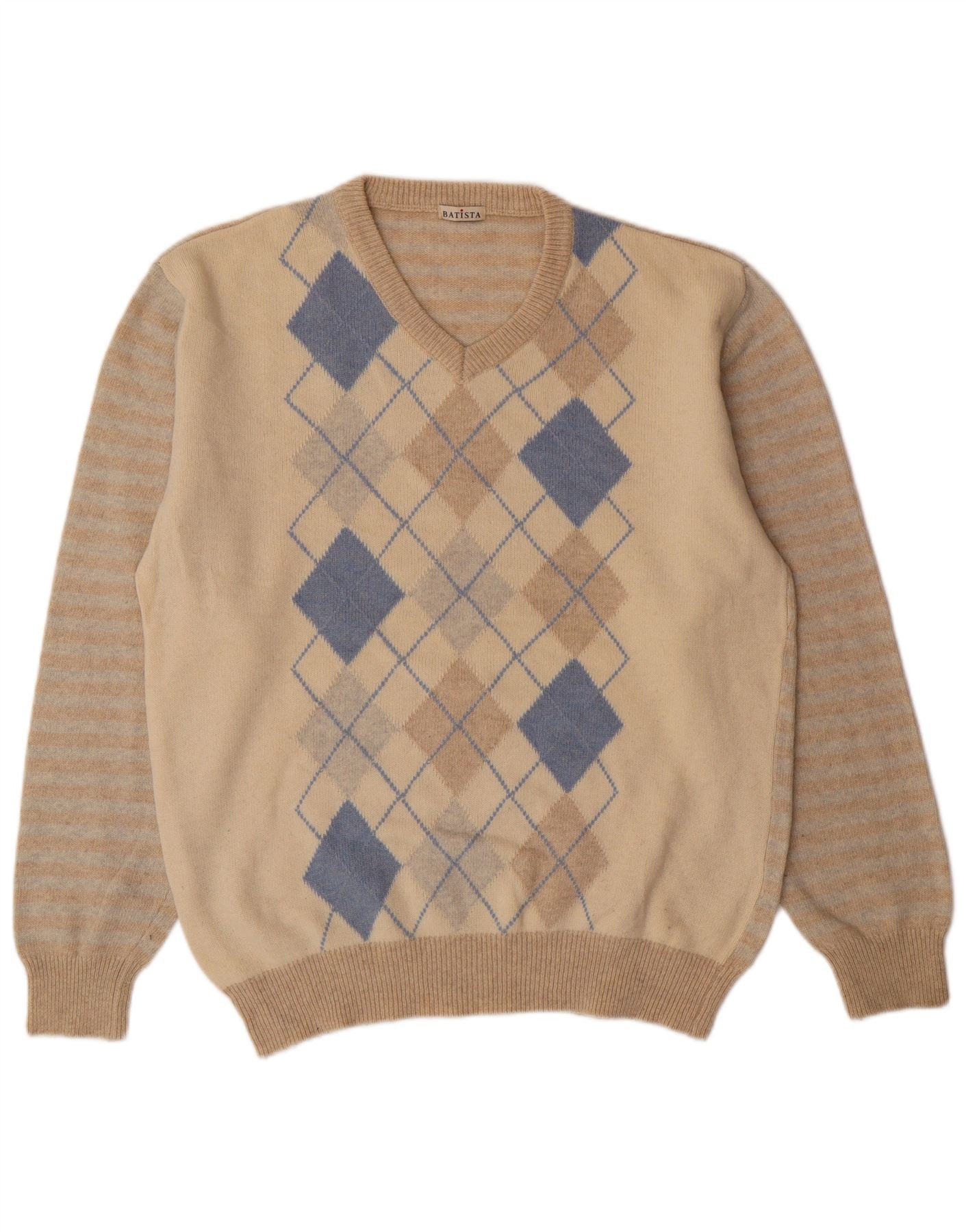 - Описание ИИ: Мужской джемпер Batista с V-образным вырезом выполнен из мягкого трикотажа из смесовой овечьей шерсти. Имеет классический V-образный вырез и длинные рукава. Регулярная посадка обеспечивает комфортное ношение. На лицевой стороне изображен характерный ромбовидный узор в бежевых и синих тонах. Рукава украшены тонкими горизонтальными полосками. Этот пуловер создает стиль преппи.