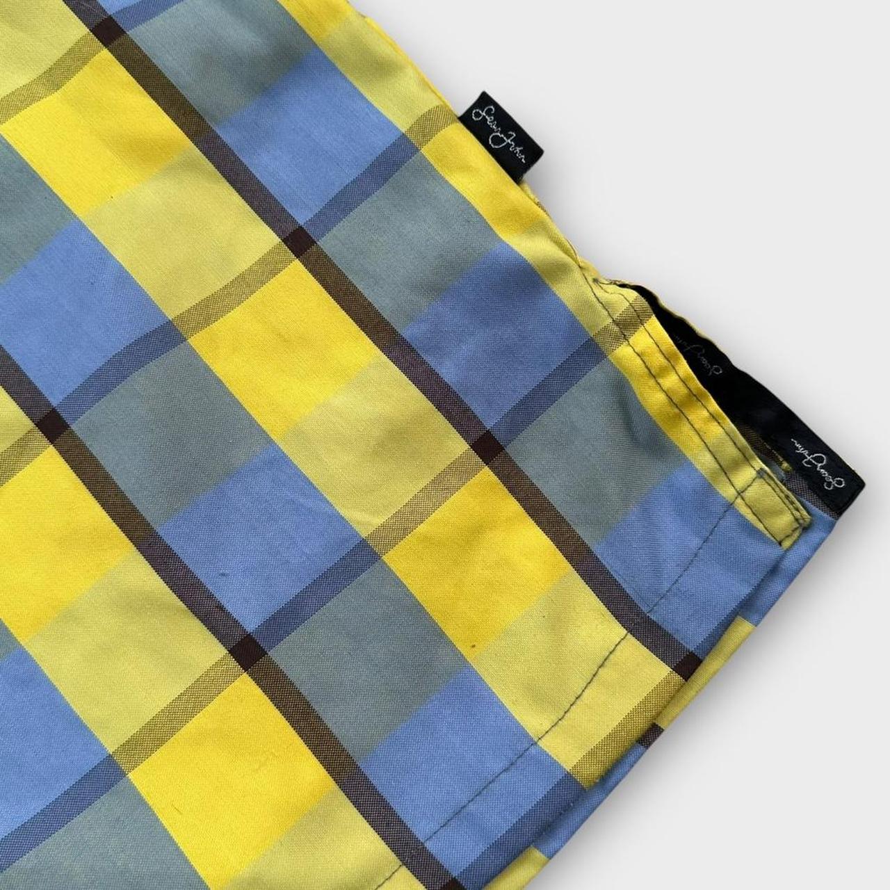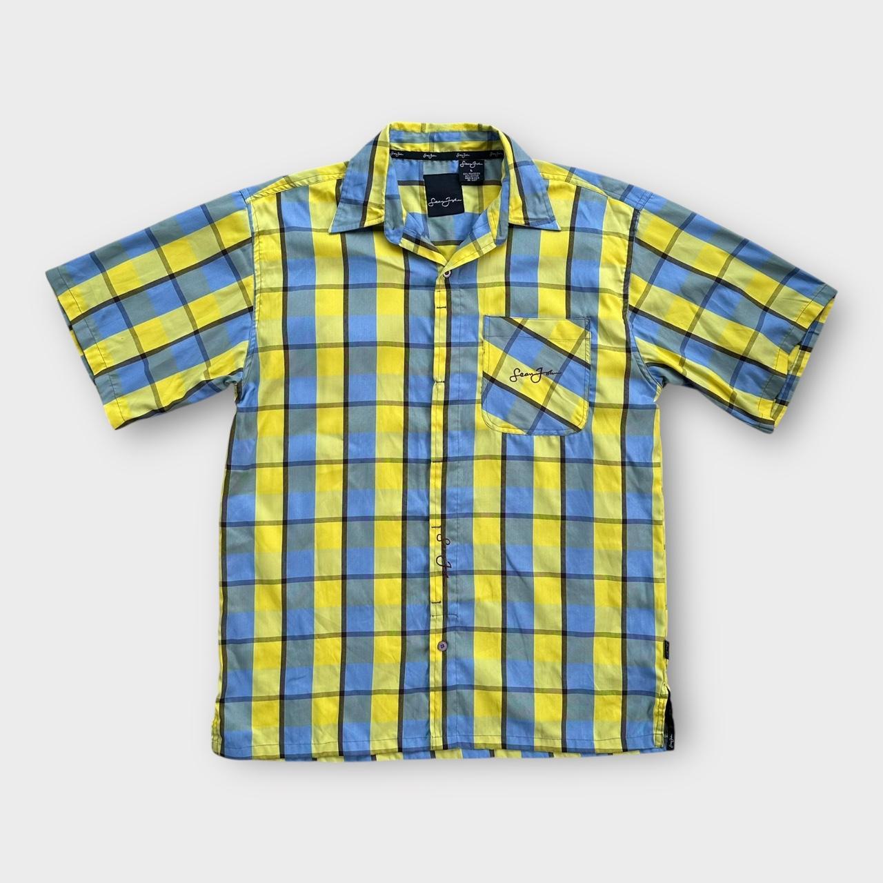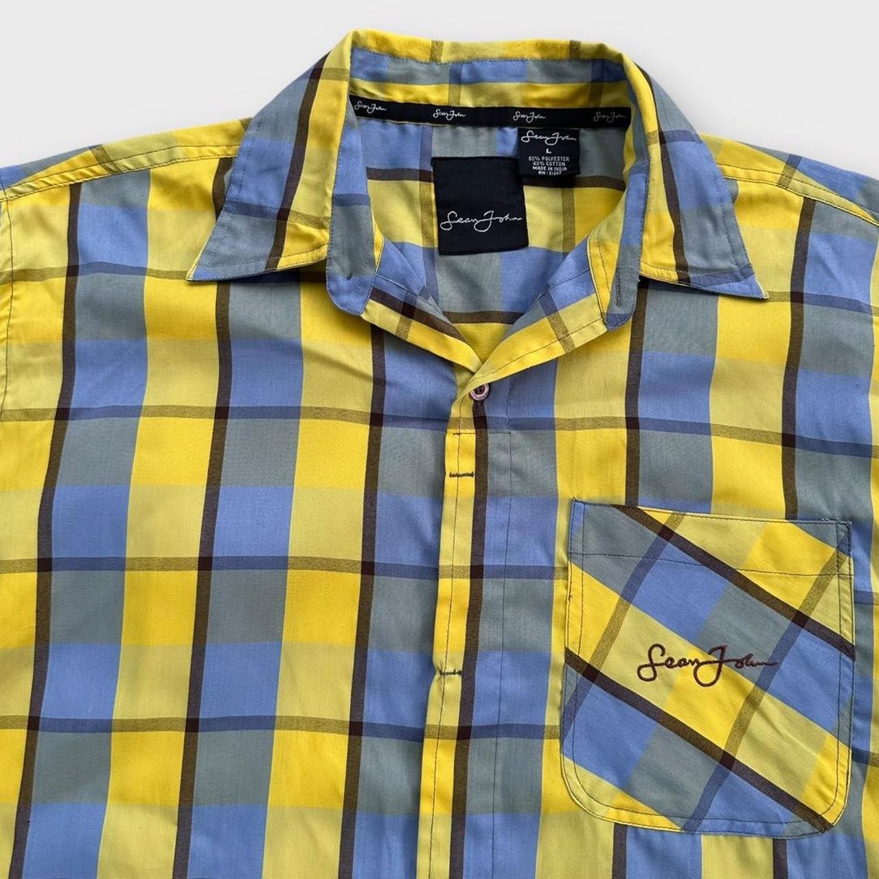 Винтажная желто-синяя рубашка Sean John с короткими рукавами начала 2000-х годов и вышитым надписью на нагрудном кармане и спереди.