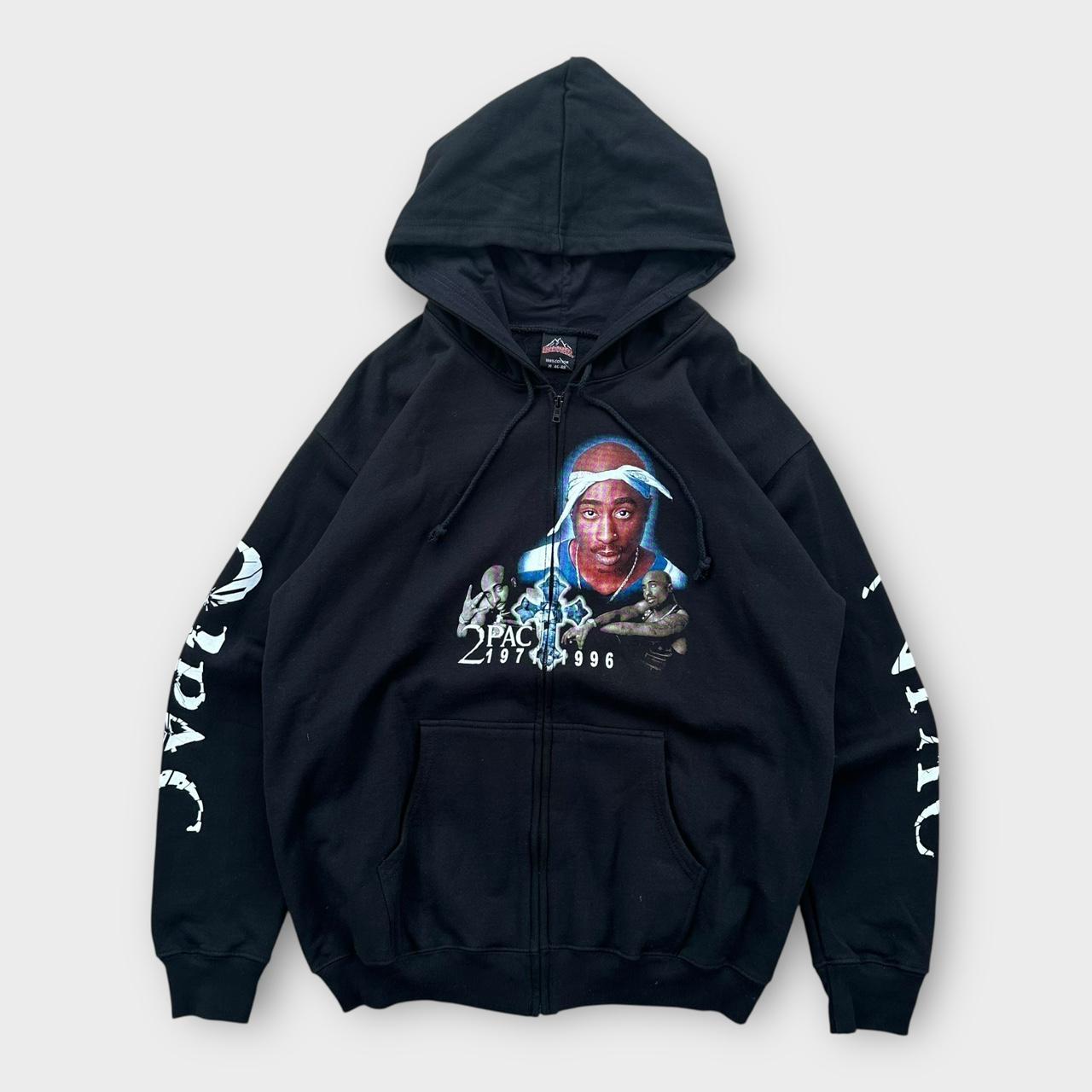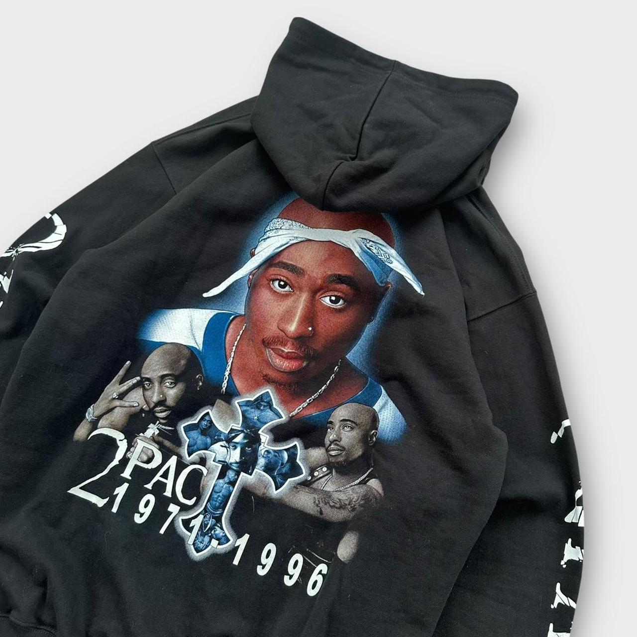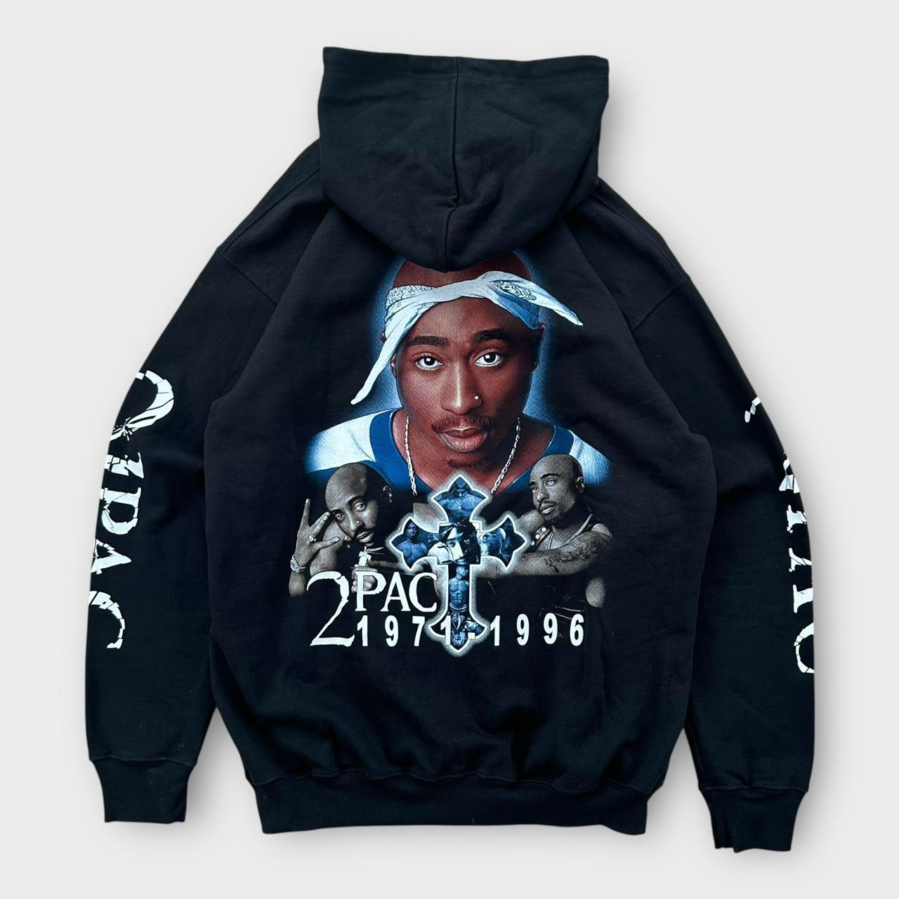 Черная толстовка с графическим принтом Tupac Y2K начала 2000-х, с графикой на груди и спине и надписью на рукавах.