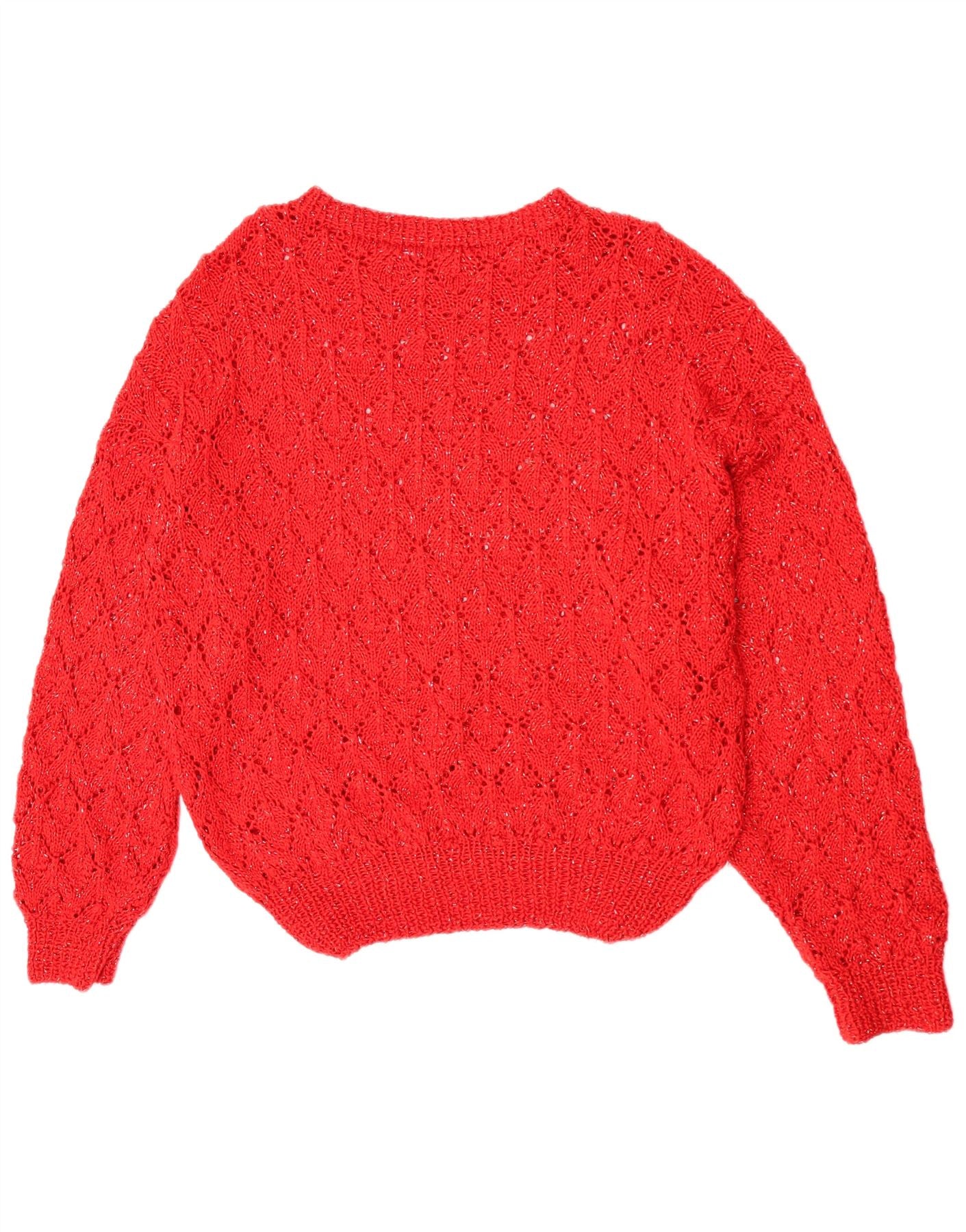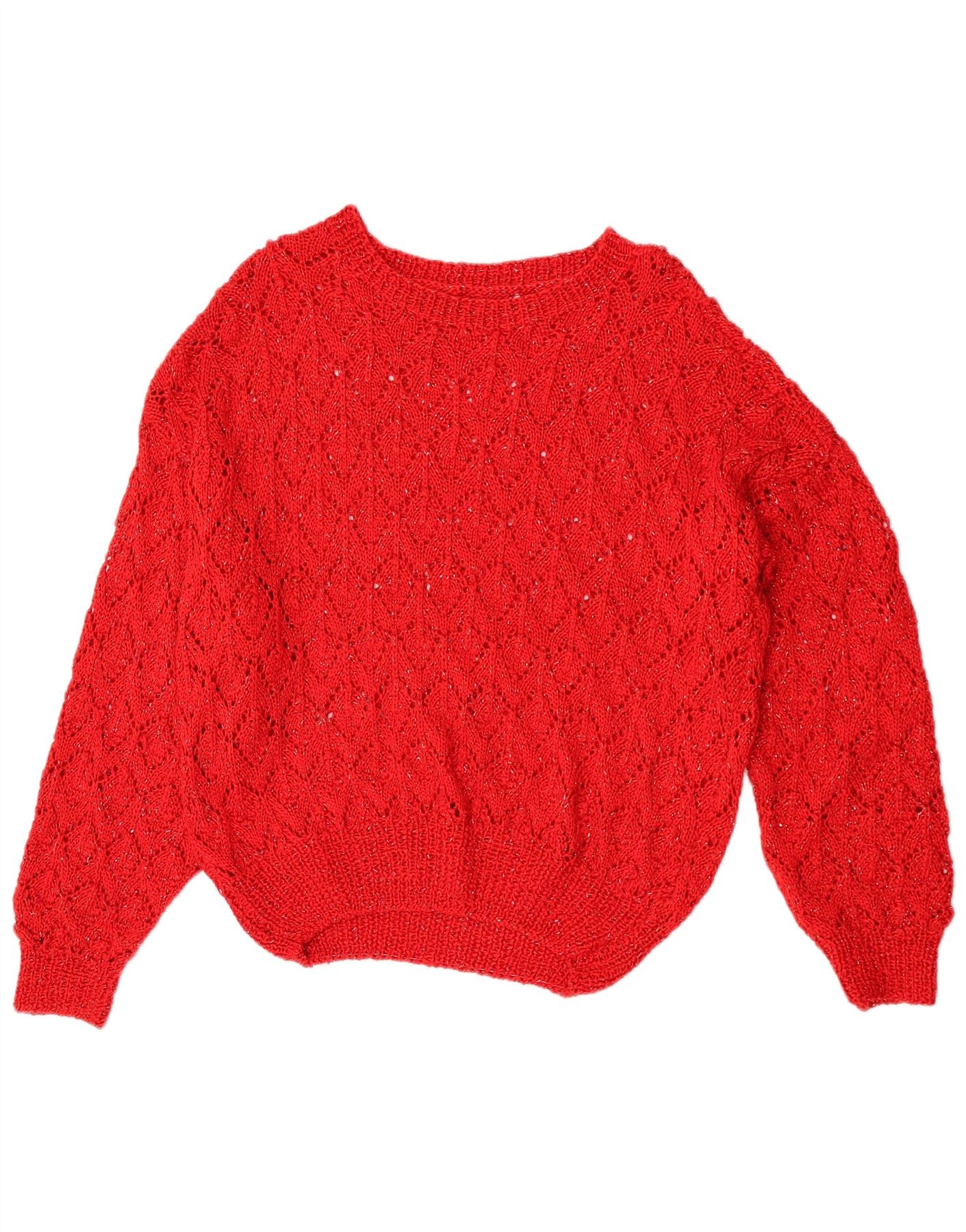 - Описание ИИ: Этот винтажный женский джемпер с круглым вырезом выполнен из легкого трикотажа яркого красного оттенка. Модель имеет классический круглый вырез и длинные рукава с манжетами на запястьях. Абстрактный ажурный узор вязки добавляет визуальный интерес и текстуру всему изделию. Стандартная посадка обеспечивает удобство ношения, что делает ее универсальной вещью в стиле ретро.