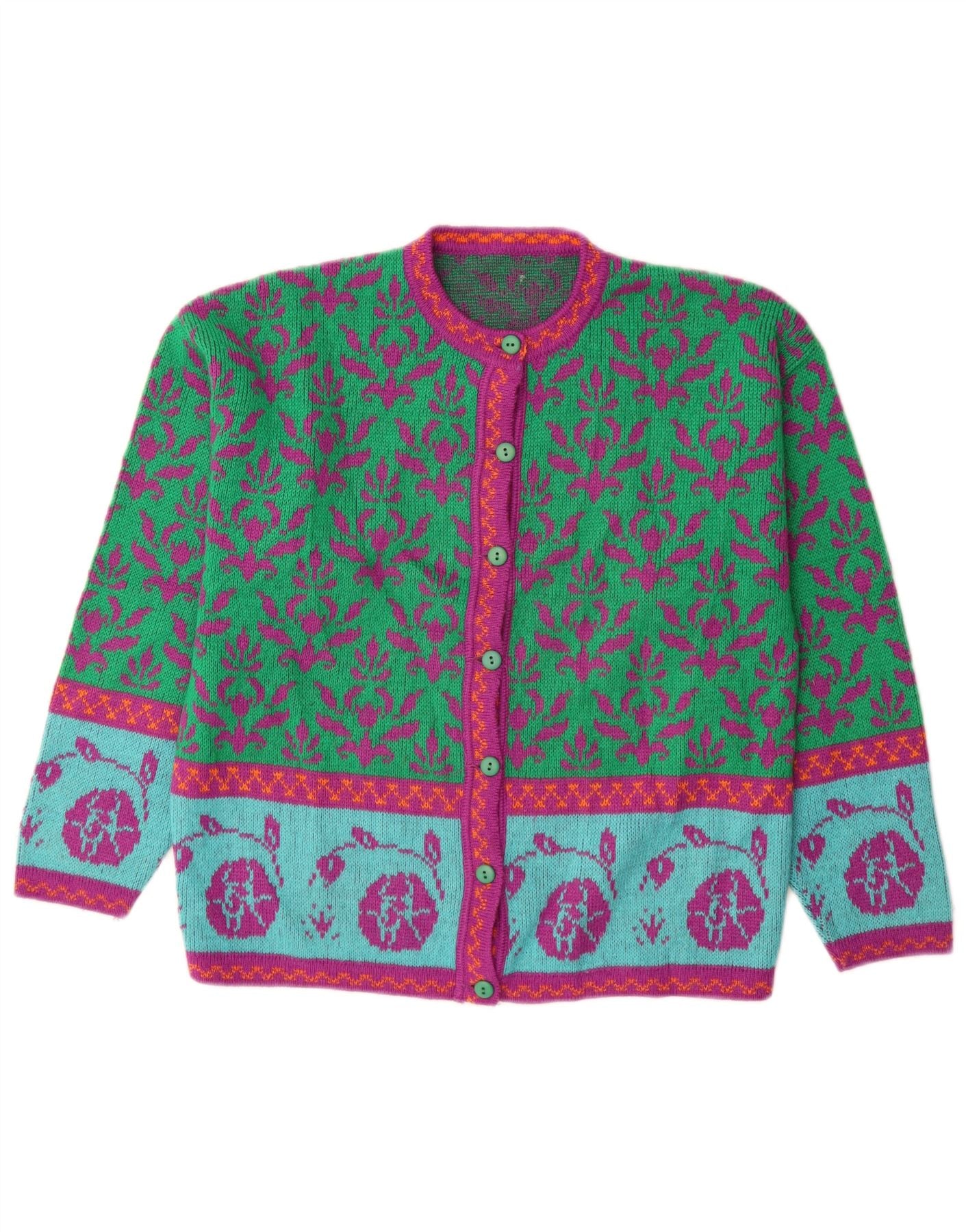 ВИНТАЖНЫЙ женский кардиган-свитер UK 14, шерсть среднего зеленого цвета с цветочным принтом