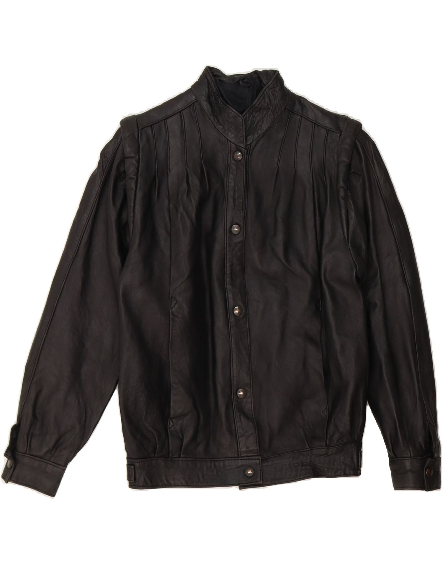 - AI Description: This vintage women's black leather jacket offers a timeless, classic style. Crafted from quality leather, this pre-owned jacket features long sleeves, a collared neckline and a button closure. The regular fit provides a comfortable silhouette, while shoulder pads and a full lining ensure a structured shape. Practical pockets add utility. The jacket is accented with buttons and pleated detailing. Condition is good, with moderate visible wear to the leather overall. This stylish jacket is perfect for adding an edgy touch to any outfit.