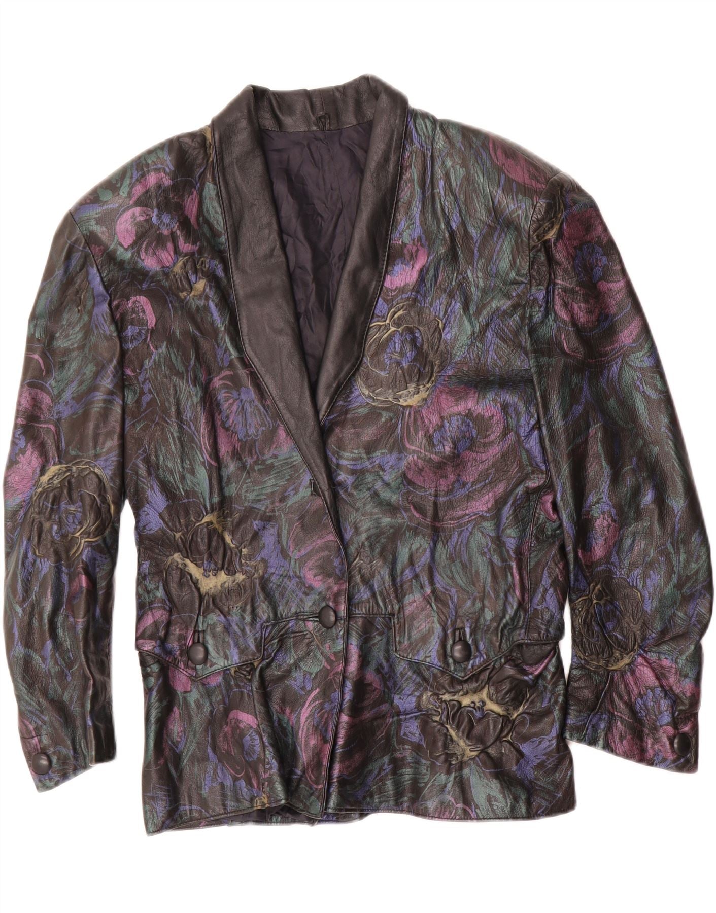 ВИНТАЖНАЯ женская кожаная куртка UK 16, большая черная кожаная с цветочным принтом