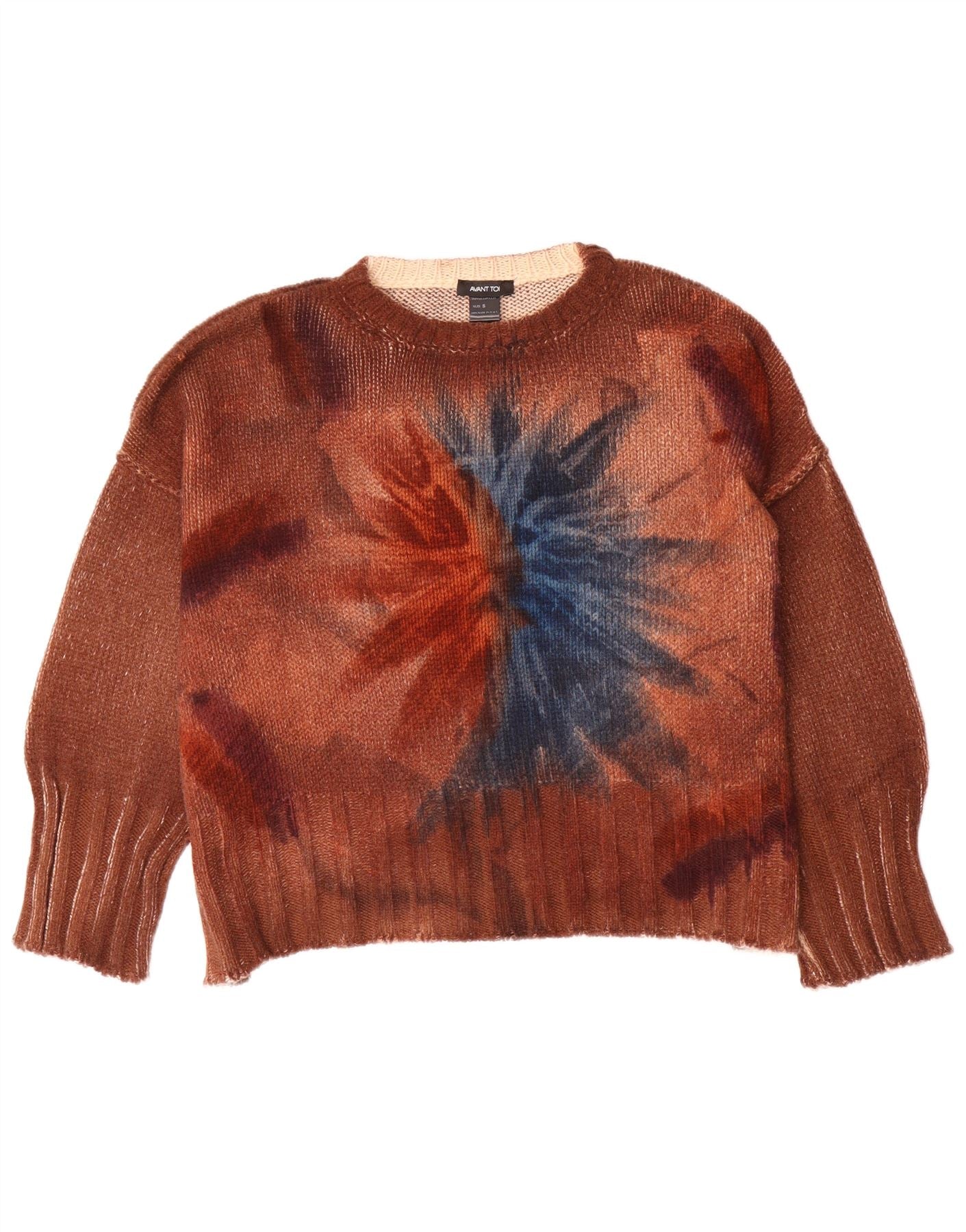 - Описание ИИ: Женский джемпер Avant Toi изготовлен из легкого трикотажа. Он украшен ярким узором тай-дай в оттенках коричневого, оранжевого и синего. Классический круглый вырез и длинные рукава обеспечивают удобную посадку. Ребристые манжеты и подол создают изящную структуру. Этот пуловер одновременно удобен и стильен и идеально подходит для ретро-эстетики.