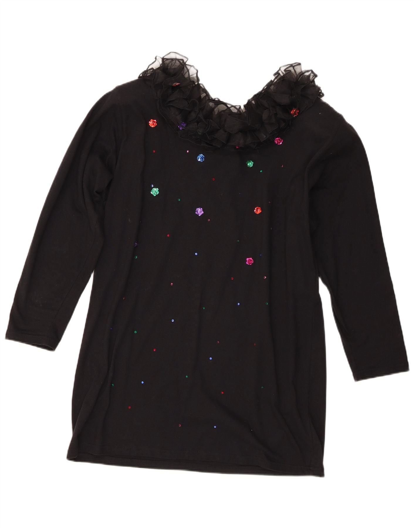 Винтажная женская туника с рюшами спереди и длинными рукавами, Великобритания, 16, большой черный хлопок