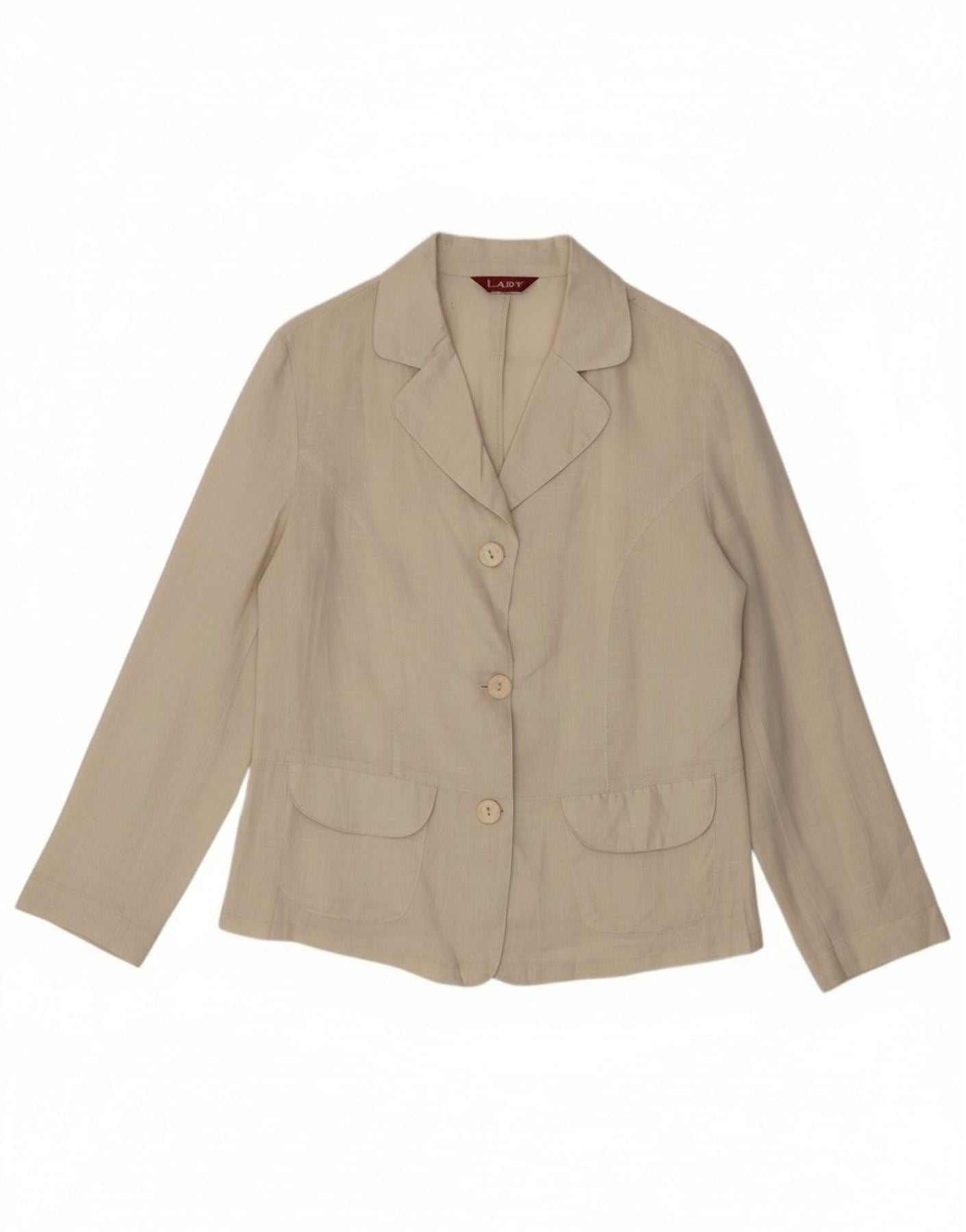 - Описание ИИ: Этот женский пиджак Lady изготовлен из 100 процентов льна с легкой тканой текстурой. Имеет классический вырез горловины и длинные рукава. Регулярная посадка обеспечивает комфортное ношение. Застежка на три пуговицы спереди дополнена практичными передними карманами. Бежевый цвет и классический стиль делают его универсальным дополнением гардероба.