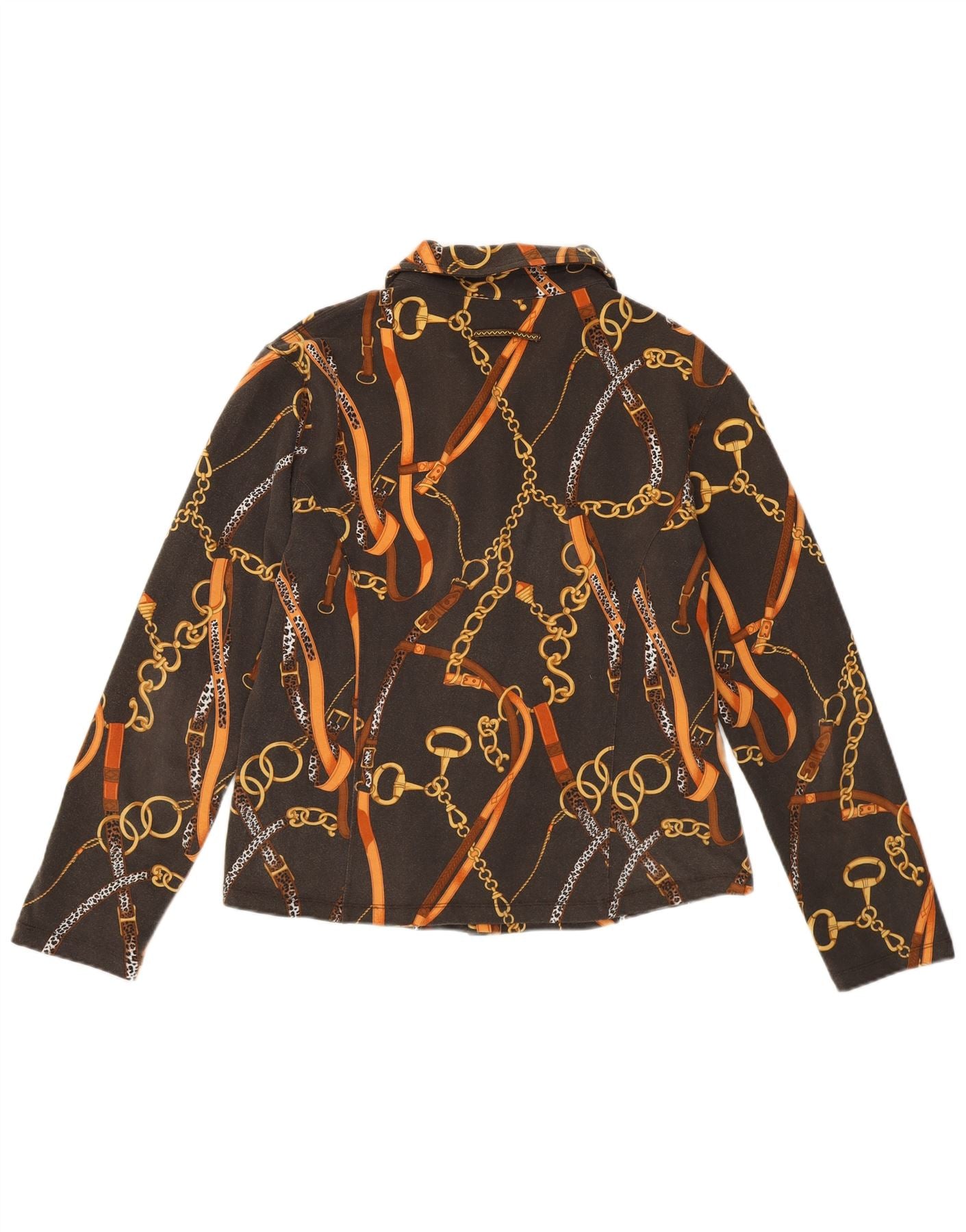 - Описание ИИ: Женский топ с воротником In Sport выполнен из мягкого эластичного хлопково-эластанового трикотажа. Модель украшена ярким графическим принтом в виде золотых цепочек и коричневых ремней на черной основе. Вырез с воротником и застежка на пуговицы спереди создают элегантный и структурированный образ. Длинные рукава и стандартный крой обеспечивают удобство ношения. Тонкие карманы добавляют практичности этому дизайну в стиле ретро.