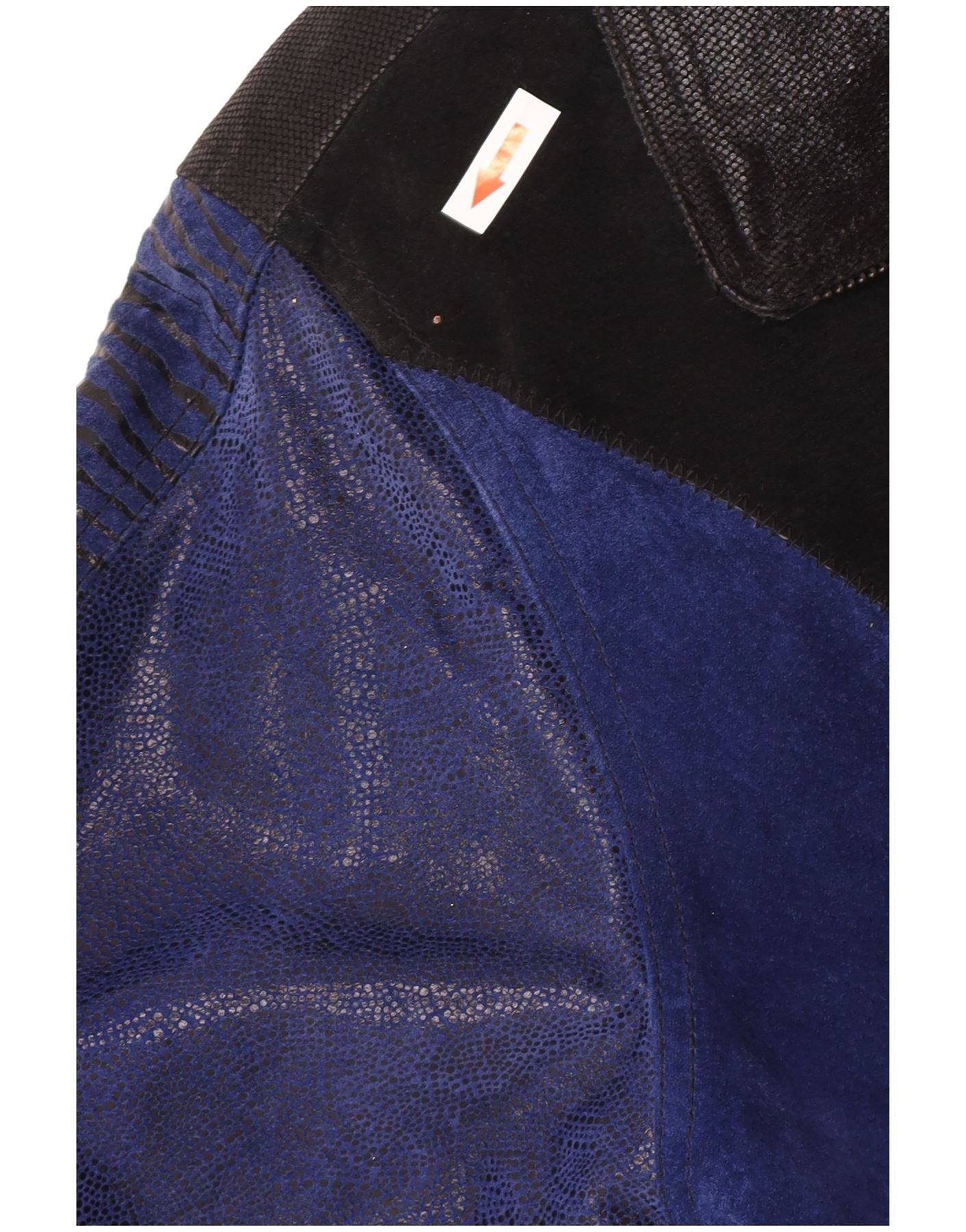 - Описание ИИ: Эта винтажная женская кожаная куртка изготовлена из натуральной кожи и украшена эффектным лоскутным узором из синих и черных вставок. Различные текстуры включают гладкую кожу, отделку, напоминающую замшу, и тисненые узоры. Имеет воротник-стойку и длинные рукава. Полная застежка-молния проходит спереди. Свободная посадка обеспечивает комфортное ношение. Смелый лоскутный дизайн создает эстетику ретро. Он полностью на подкладке и имеет практичные карманы.