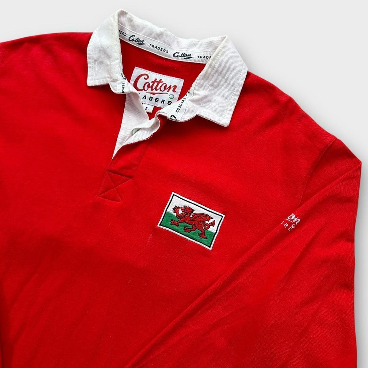 Винтажная футболка для регби Уэльса 90-х годов от торговцев хлопком, красно-белая с вышитыми логотипами на груди и спине.