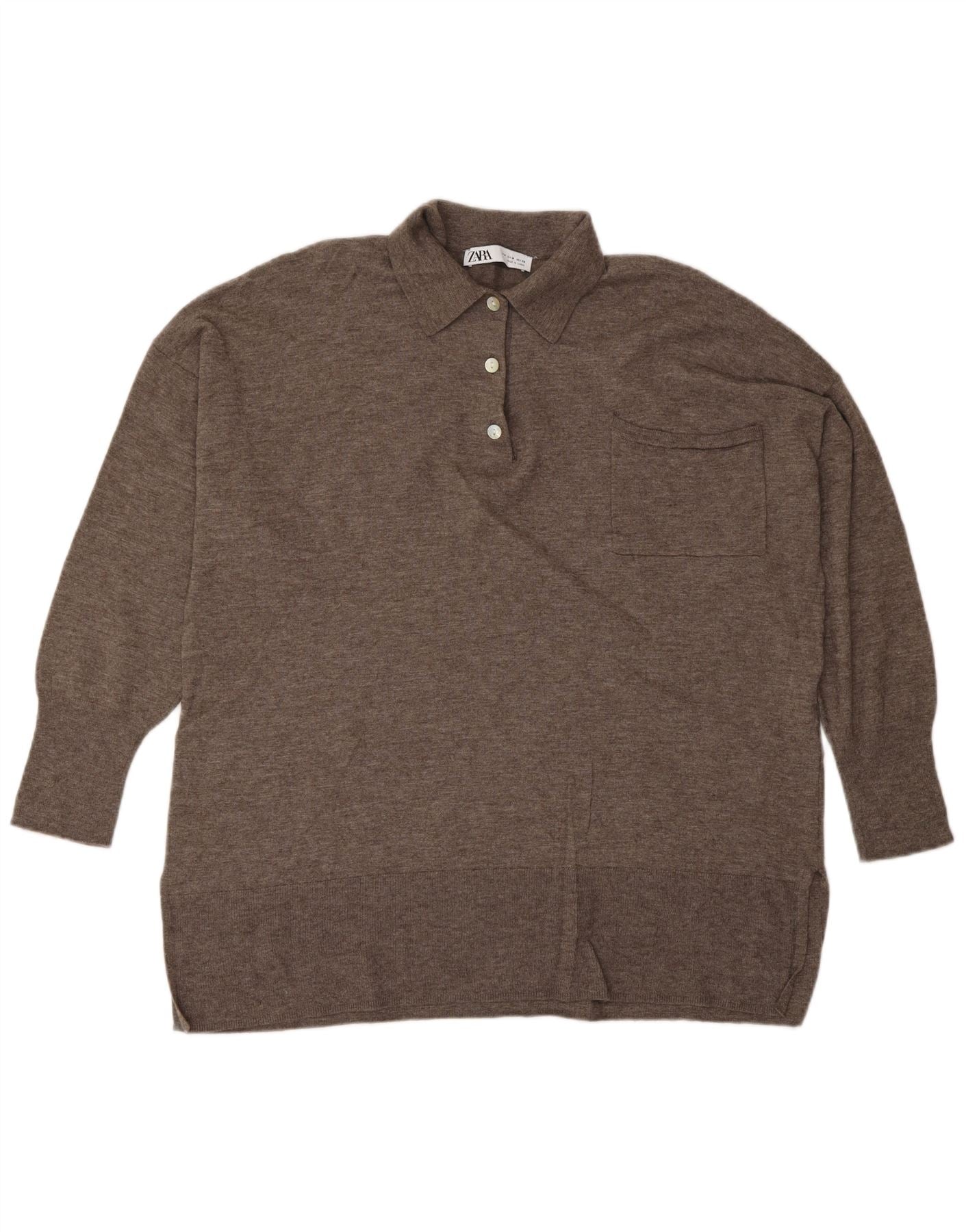 Женский джемпер с воротником поло ZARA, коричневый шерстяной свитер среднего размера