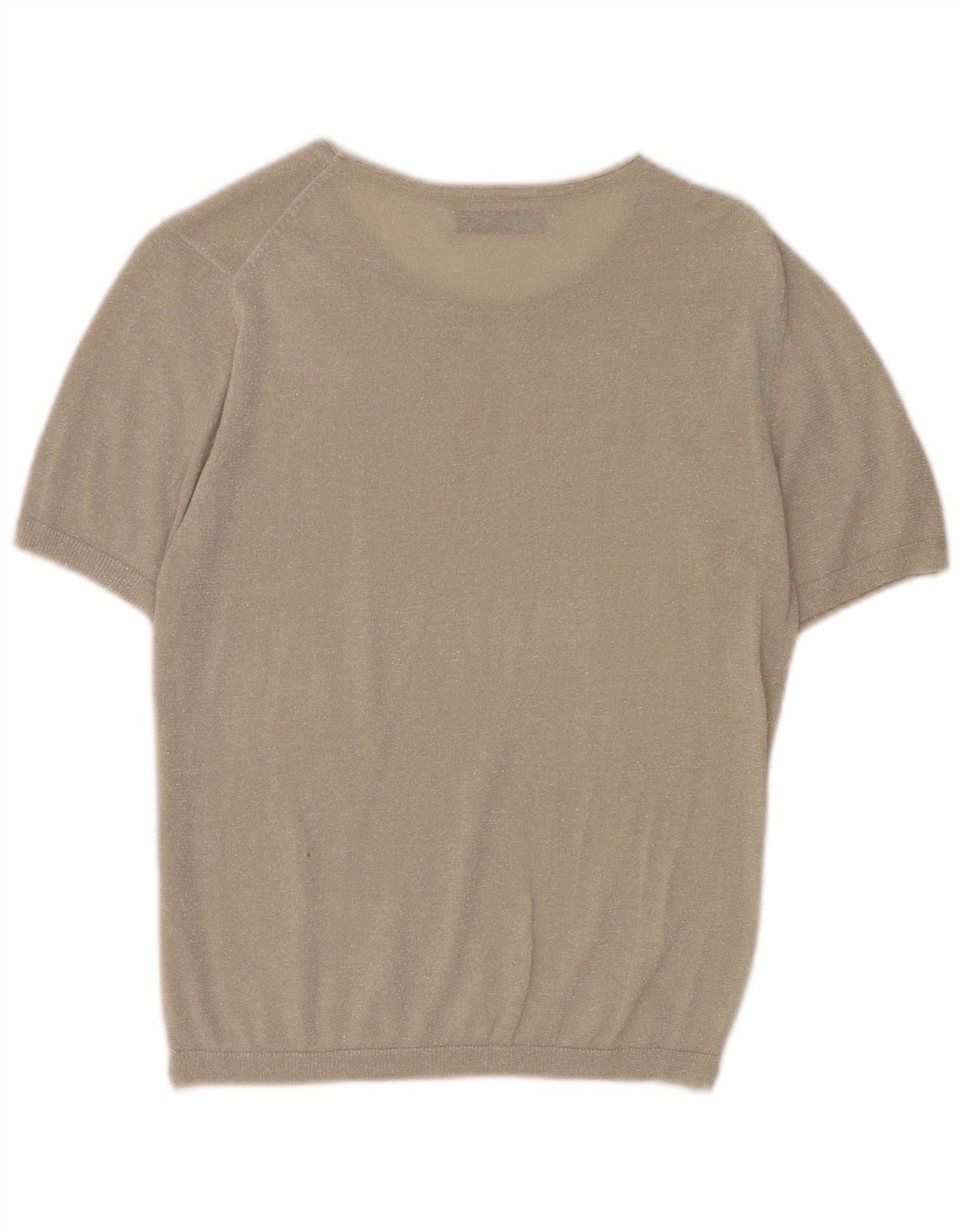 - Описание ИИ: Женский топ-футболка Zara выполнен из легкого трикотажа бежевого цвета с тонким блестящим акцентом. Имеет классический круглый вырез горловины и короткие рукава. Классический крой обеспечивает удобство ношения и универсальный силуэт. Трикотажная конструкция обеспечивает мягкую текстуру и легкое растяжение. Этот современный пуловер идеально подходит для непринужденного стиля.