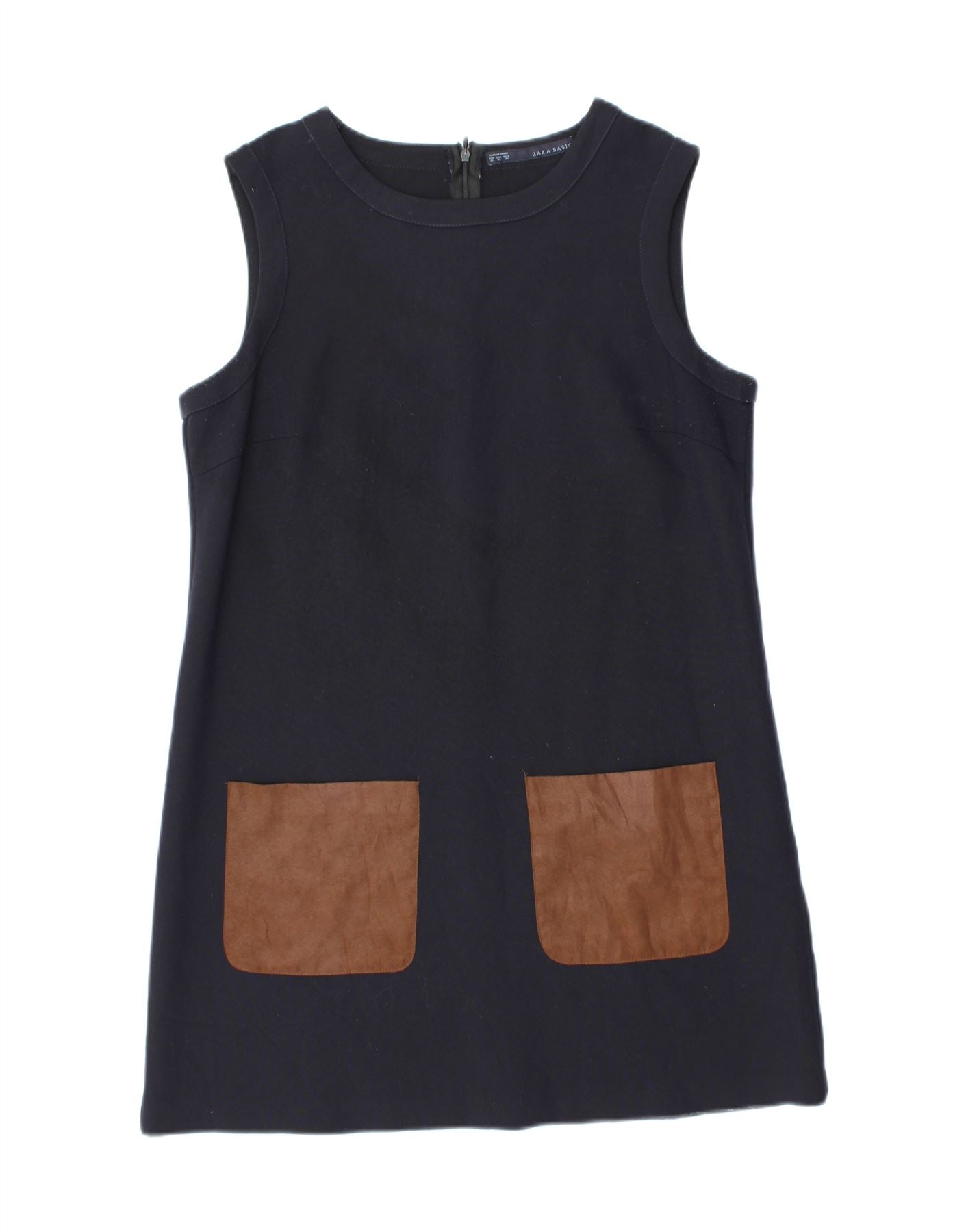 - Описание ИИ: Женское свободное платье Zara выполнено из гладкой смесовой ткани черного цвета. Модель имеет классический круглый вырез и изящный крой без рукавов. Классический крой создает удобный, но изысканный силуэт. Два контрастных коричневых накладных кармана украшают переднюю часть, добавляя отличительную деталь. Незаметная застежка-молния сзади обеспечивает чистоту. Это современное платье сочетает в себе простоту и практичность.